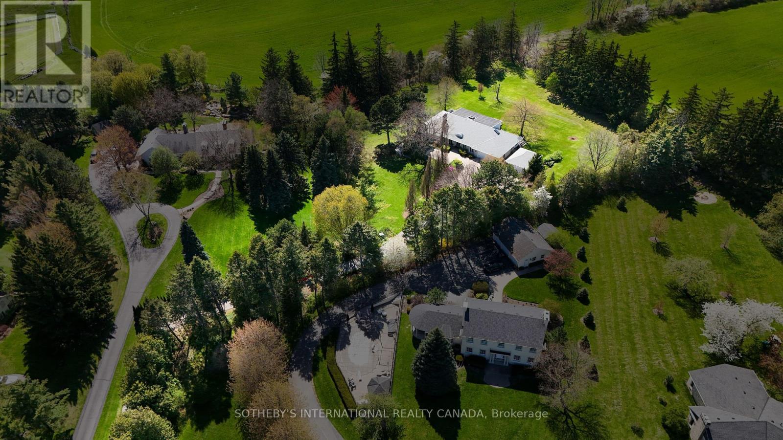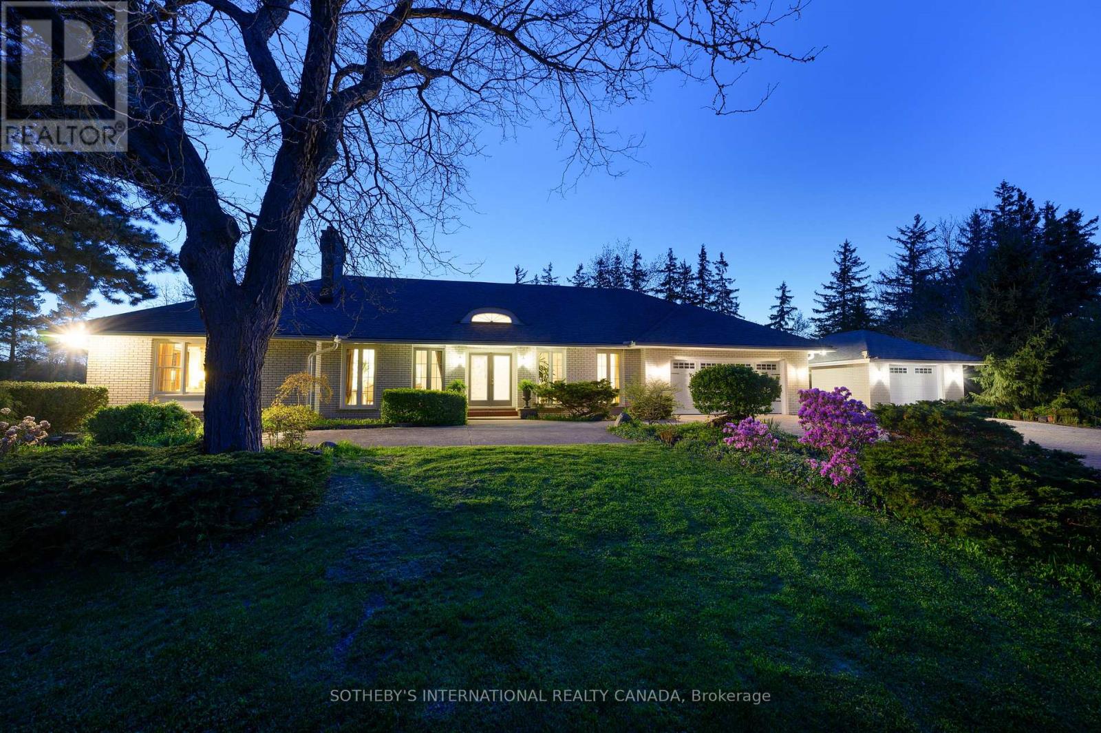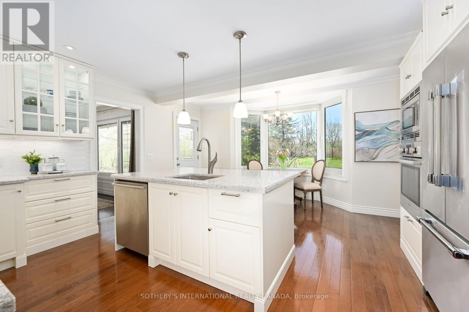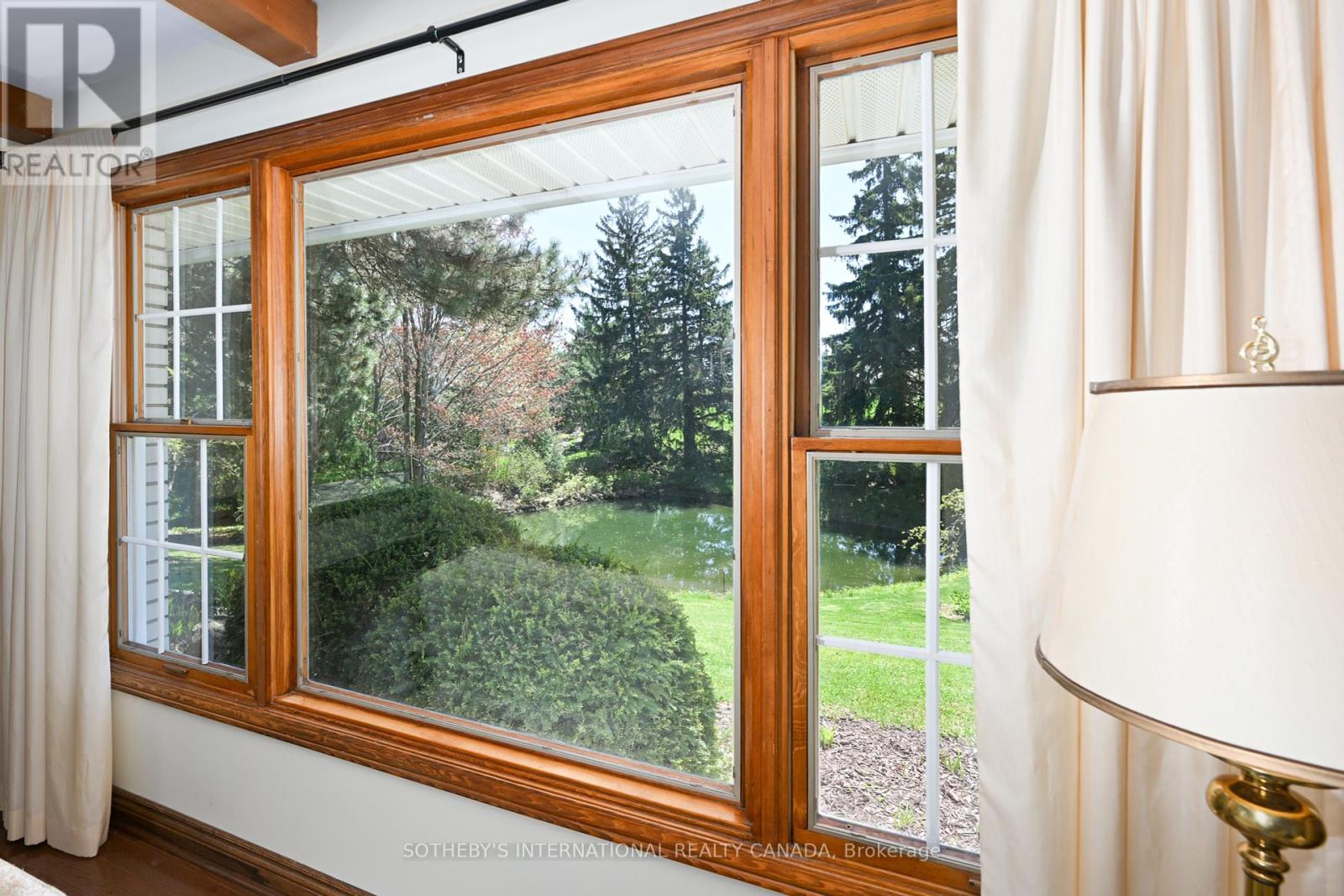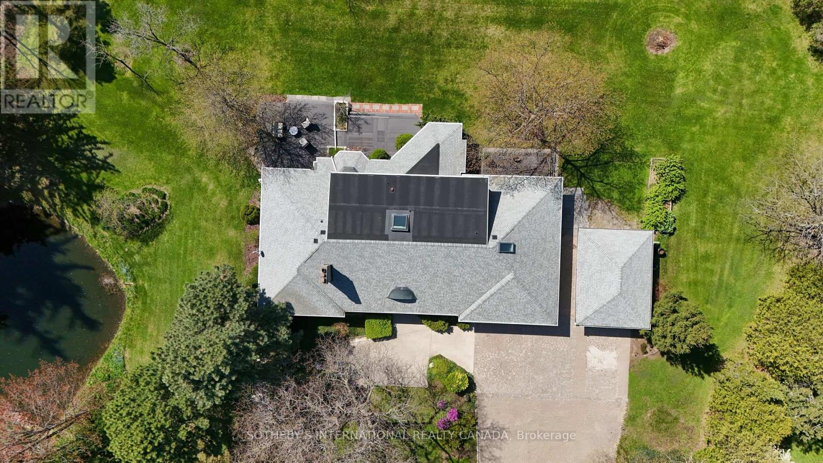 Follow the winding 400-foot paved driveway and discover a world of privacy, elegance, and serenity all just minutes from the city. Nestled on 1.66 acres of beautifully secluded land, this extraordinary home feels like a countryside retreat, yet it's only 2.5 km from Hwy 5, 3 km to Hwy 407, and close to major shopping and conveniences. Step inside and be charmed by nearly 4,800 sq ft of exquisitely finished living space. The grand foyer greets you with a vaulted ceiling that soars and opens to the second floor, creating an impressive sense of space and elegance, setting the tone for the home's thoughtfully designed interior. Crafted for those who appreciate timeless beauty and detail, every room tells a story from rich 3/4" oak hardwood floors, custom millwork, with elegant crown molding through-out to oversized windows framing peaceful, ever-changing views. At the heart of the home, the modern-classic kitchen blends premium appliances with inviting warmth. Enjoy sunny mornings in the cozy breakfast nook and host elegant dinners in the formal dining room. The main floor offers a graceful flow with a living room, family room, and a versatile bedroom with a 4-piece bath perfect for guests, a home office, or in-laws. The primary suite is a true sanctuary, featuring a spa-like ensuite, a custom dressing room, and French doors that open to a private patio perfect for morning coffee or stargazing. Upstairs are two spacious bedrooms, a well-appointed bathroom, and a skylit bonus room ideal as a studio, den or potential fifth bedroom. The lower level includes a large rec/games area, a workshop, and ample storage. Outside, unwind on tranquil patios surrounded by lush landscaping, mature trees, and a serene pond teeming with carp. This is more than a home it's a feeling. A rare blend of quiet luxury, natural beauty, and modern convenience. Come experience it for yourself. (id:24334)