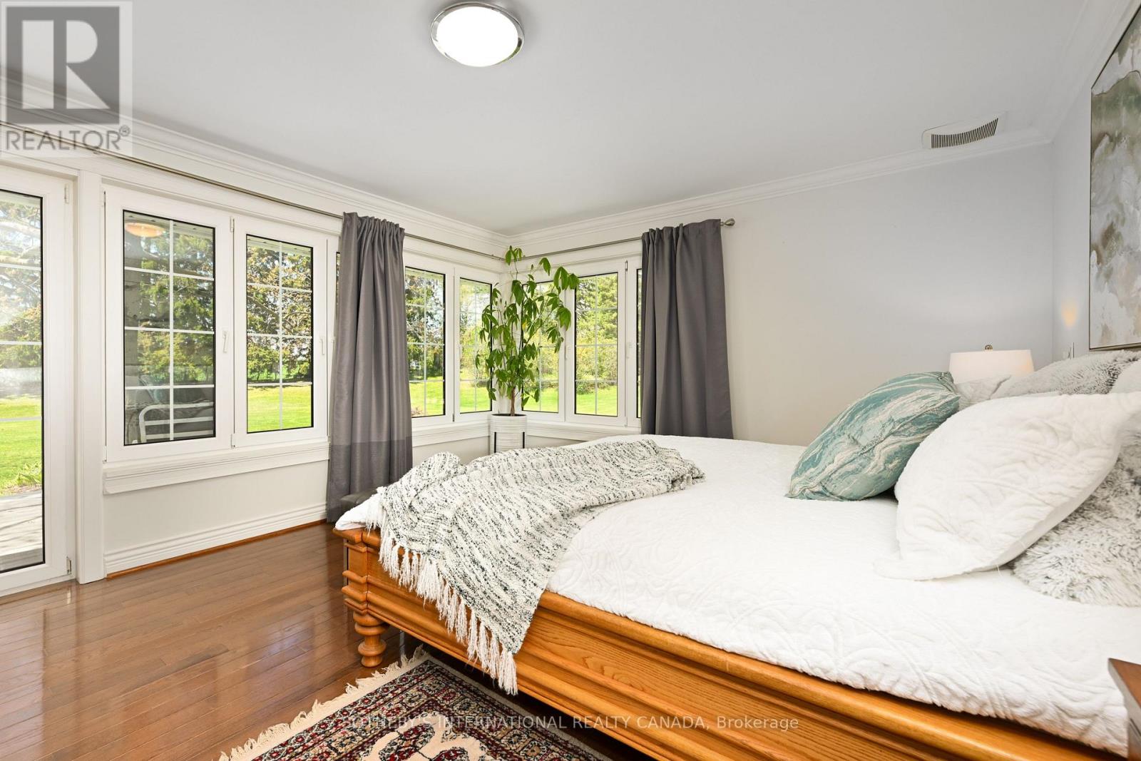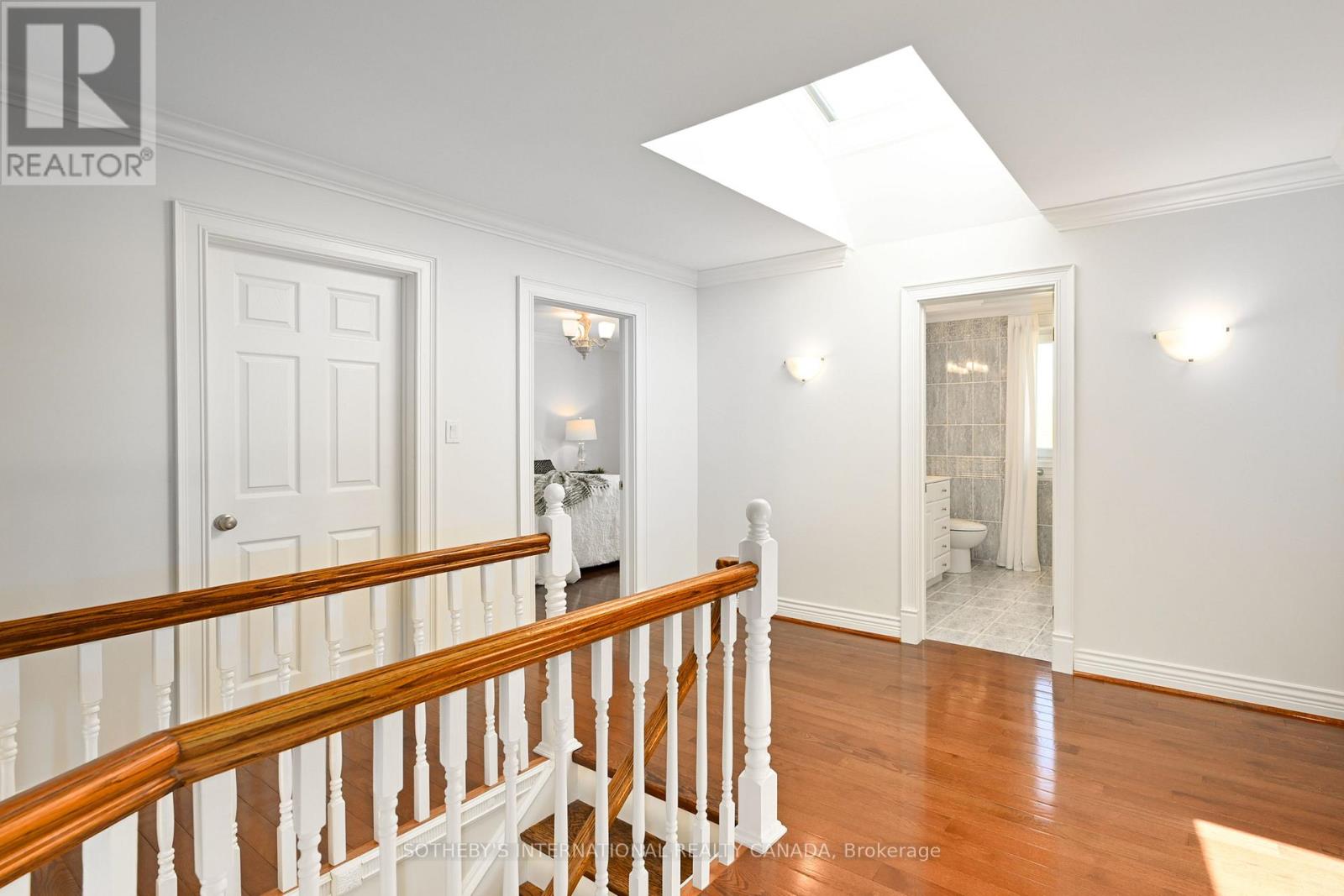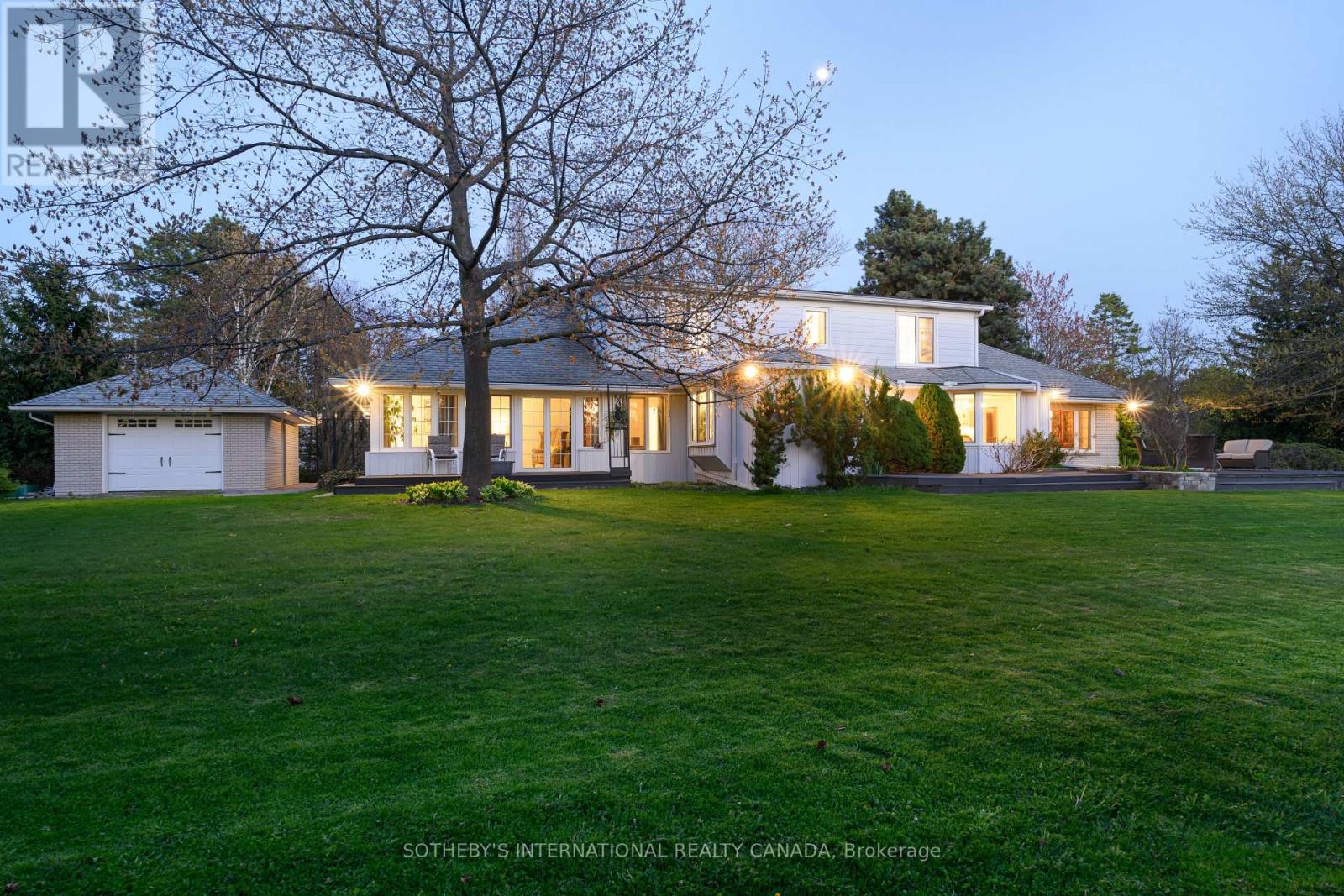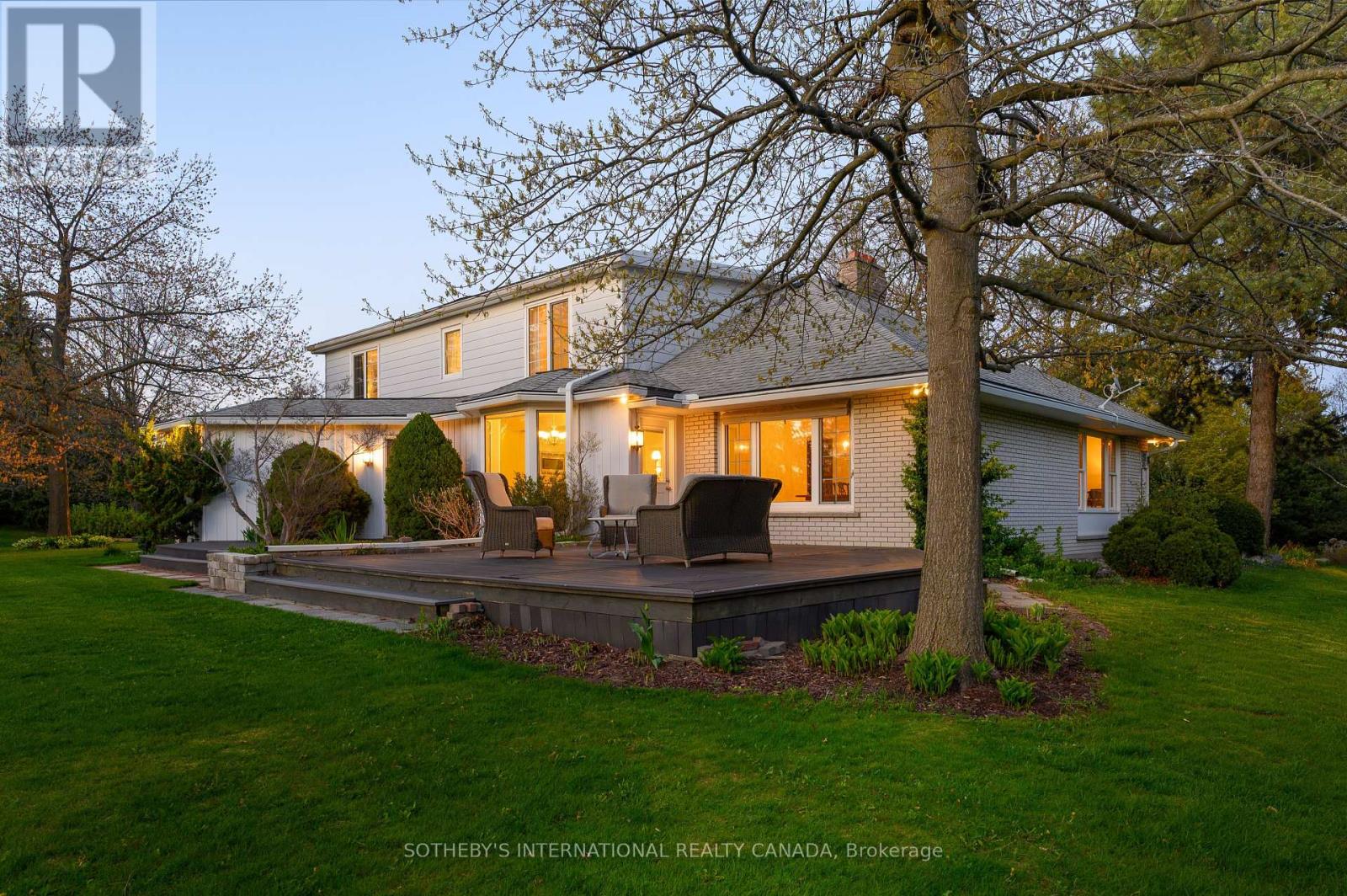 Follow the winding 400-foot paved driveway and discover a world of privacy, elegance, and serenity all just minutes from the city. Nestled on 1.66 acres of beautifully secluded land, this extraordinary home feels like a countryside retreat, yet it's only 2.5 km from Hwy 5, 3 km to Hwy 407, and close to major shopping and conveniences. Step inside and be charmed by nearly 4,800 sq ft of exquisitely finished living space. The grand foyer greets you with a vaulted ceiling that soars and opens to the second floor, creating an impressive sense of space and elegance, setting the tone for the home's thoughtfully designed interior. Crafted for those who appreciate timeless beauty and detail, every room tells a story from rich 3/4" oak hardwood floors, custom millwork, with elegant crown molding through-out to oversized windows framing peaceful, ever-changing views. At the heart of the home, the modern-classic kitchen blends premium appliances with inviting warmth. Enjoy sunny mornings in the cozy breakfast nook and host elegant dinners in the formal dining room. The main floor offers a graceful flow with a living room, family room, and a versatile bedroom with a 4-piece bath perfect for guests, a home office, or in-laws. The primary suite is a true sanctuary, featuring a spa-like ensuite, a custom dressing room, and French doors that open to a private patio perfect for morning coffee or stargazing. Upstairs are two spacious bedrooms, a well-appointed bathroom, and a skylit bonus room ideal as a studio, den or potential fifth bedroom. The lower level includes a large rec/games area, a workshop, and ample storage. Outside, unwind on tranquil patios surrounded by lush landscaping, mature trees, and a serene pond teeming with carp. This is more than a home it's a feeling. A rare blend of quiet luxury, natural beauty, and modern convenience. Come experience it for yourself. (id:24334)