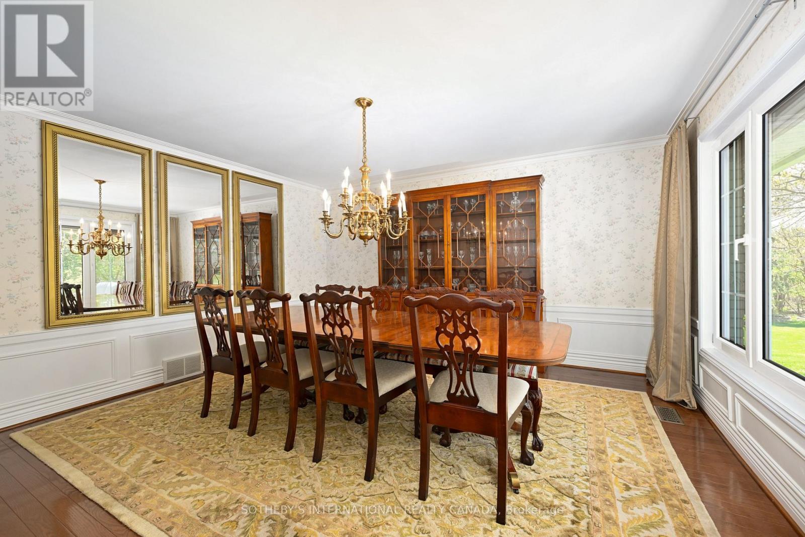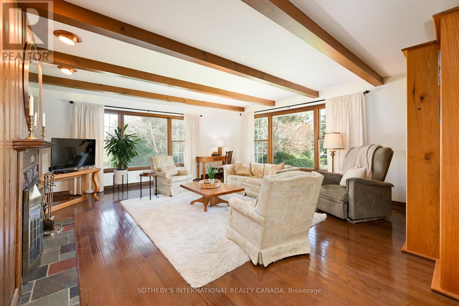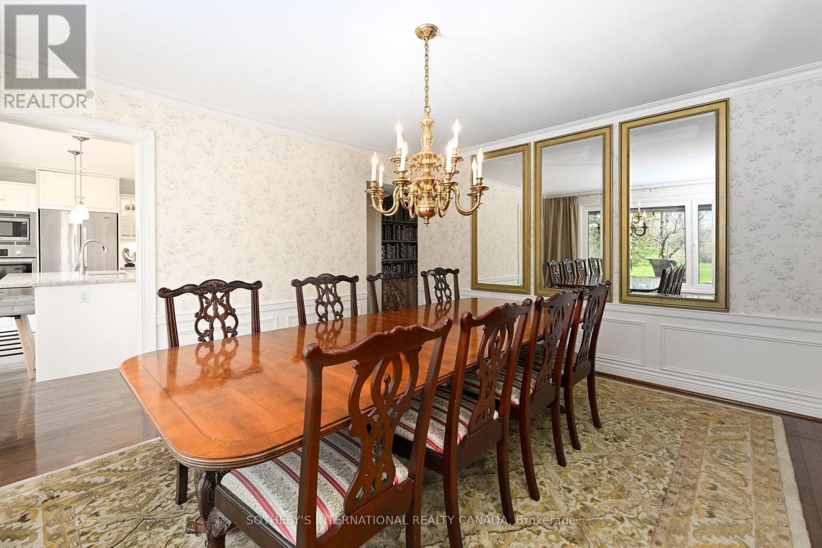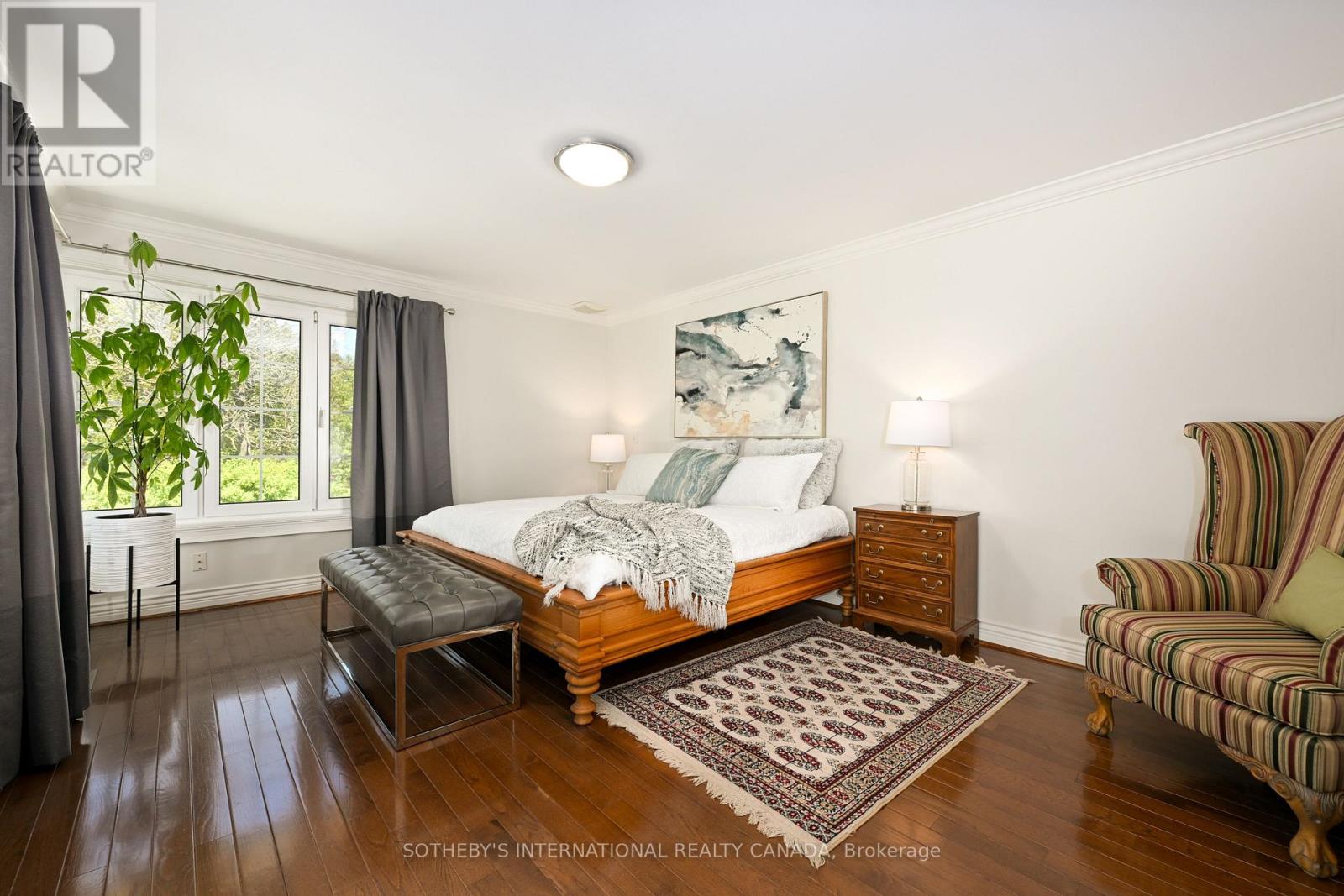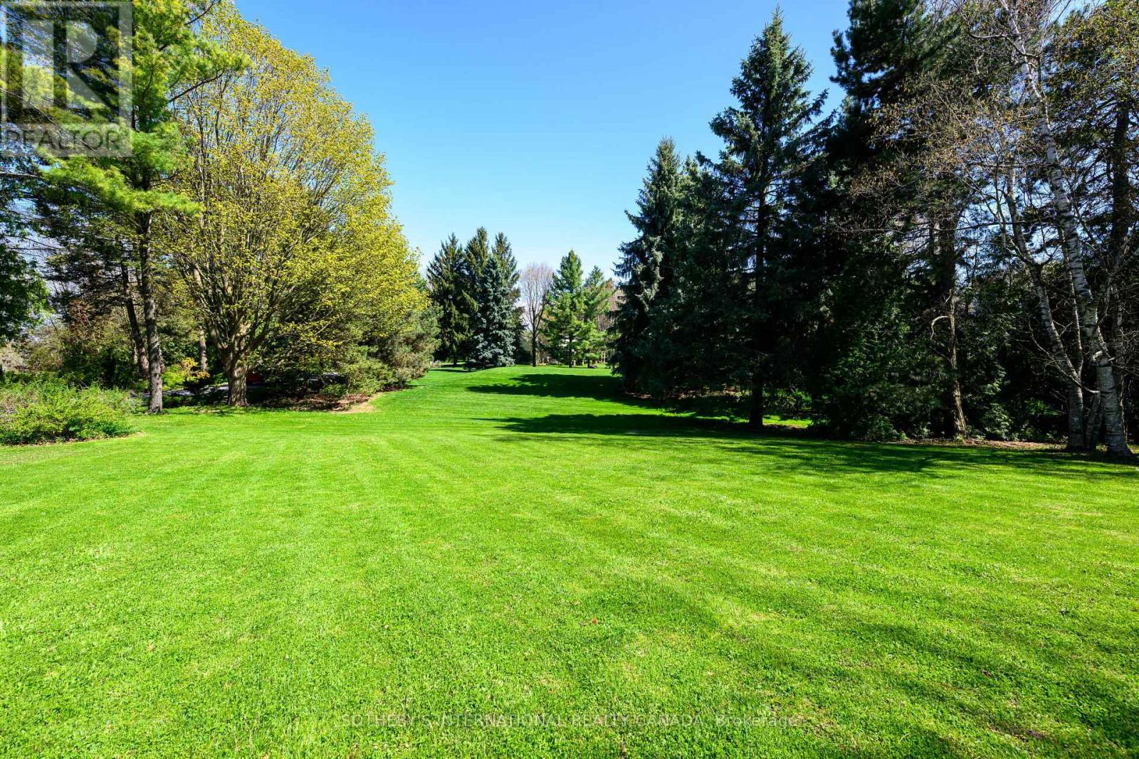 Follow the winding 400-foot paved driveway and discover a world of privacy, elegance, and serenity all just minutes from the city. Nestled on 1.66 acres of beautifully secluded land, this extraordinary home feels like a countryside retreat, yet it's only 2.5 km from Hwy 5, 3 km to Hwy 407, and close to major shopping and conveniences. Step inside and be charmed by nearly 4,800 sq ft of exquisitely finished living space. The grand foyer greets you with a vaulted ceiling that soars and opens to the second floor, creating an impressive sense of space and elegance, setting the tone for the home's thoughtfully designed interior. Crafted for those who appreciate timeless beauty and detail, every room tells a story from rich 3/4" oak hardwood floors, custom millwork, with elegant crown molding through-out to oversized windows framing peaceful, ever-changing views. At the heart of the home, the modern-classic kitchen blends premium appliances with inviting warmth. Enjoy sunny mornings in the cozy breakfast nook and host elegant dinners in the formal dining room. The main floor offers a graceful flow with a living room, family room, and a versatile bedroom with a 4-piece bath perfect for guests, a home office, or in-laws. The primary suite is a true sanctuary, featuring a spa-like ensuite, a custom dressing room, and French doors that open to a private patio perfect for morning coffee or stargazing. Upstairs are two spacious bedrooms, a well-appointed bathroom, and a skylit bonus room ideal as a studio, den or potential fifth bedroom. The lower level includes a large rec/games area, a workshop, and ample storage. Outside, unwind on tranquil patios surrounded by lush landscaping, mature trees, and a serene pond teeming with carp. This is more than a home it's a feeling. A rare blend of quiet luxury, natural beauty, and modern convenience. Come experience it for yourself. (id:24334)