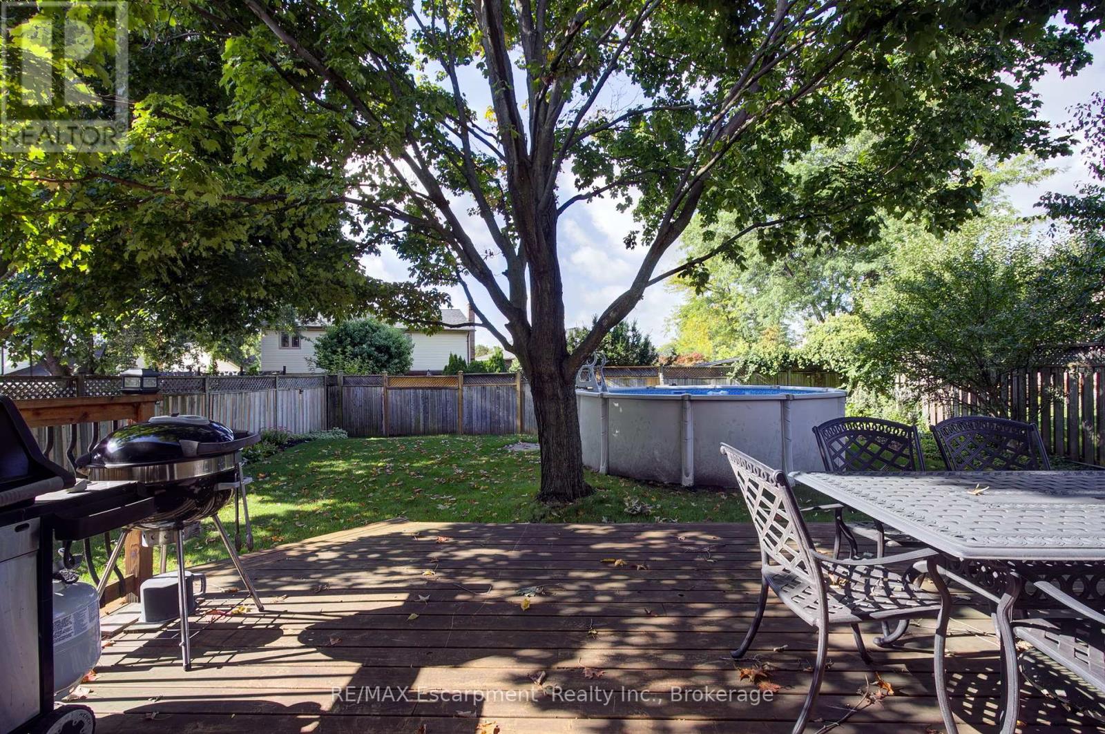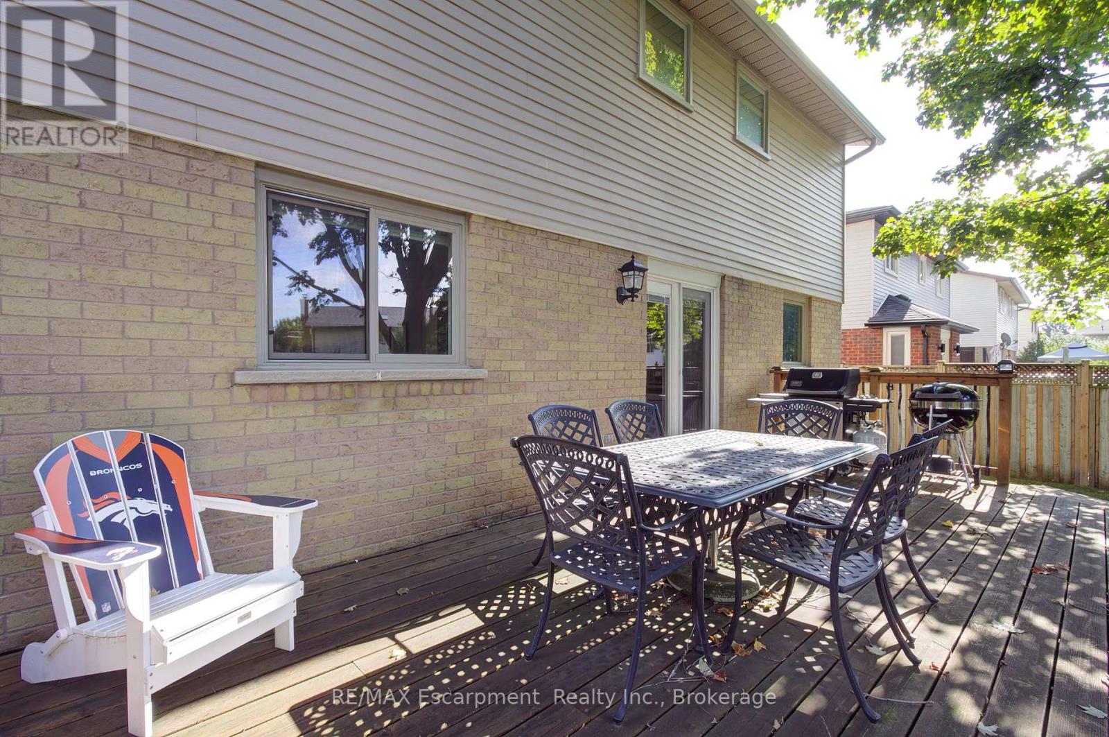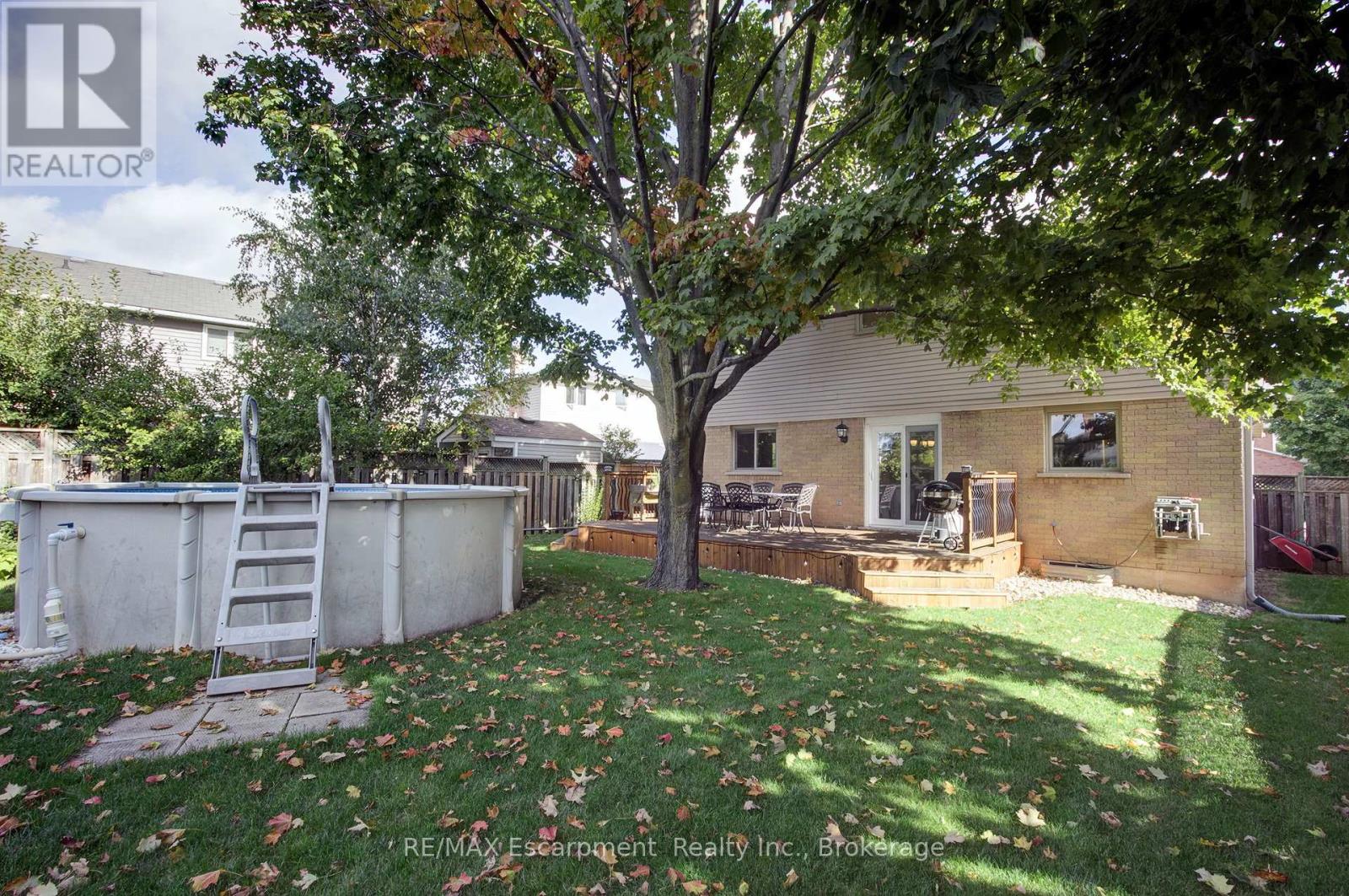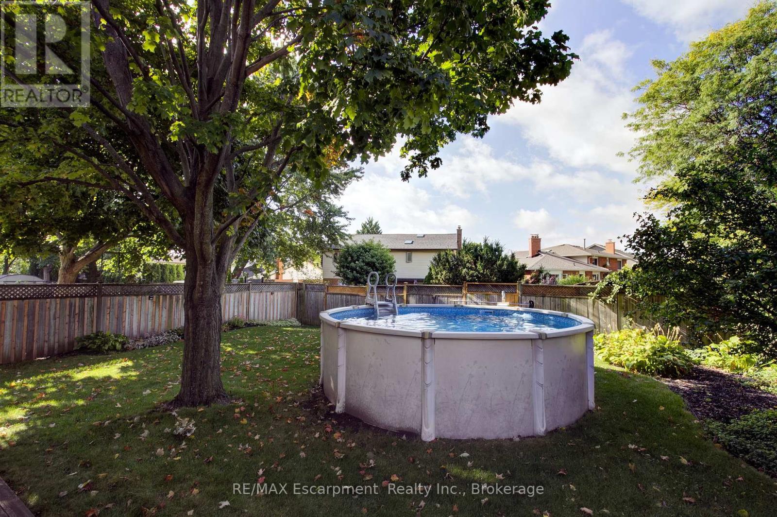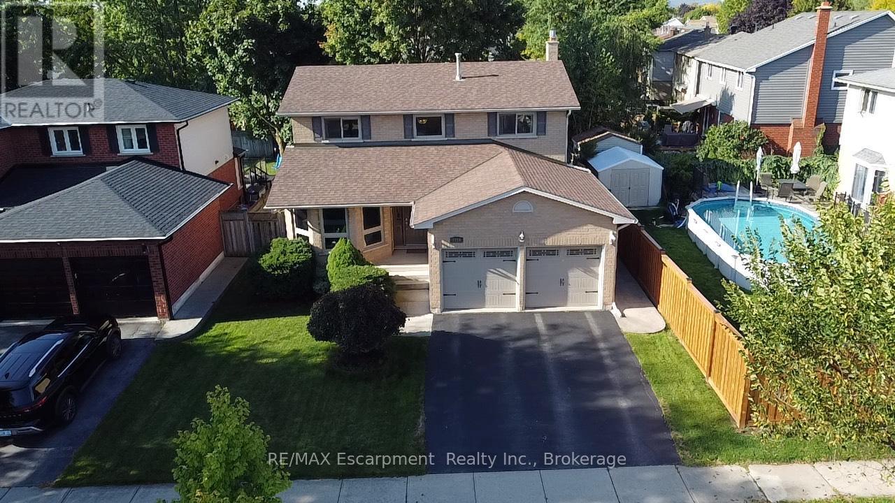 Beautifully updated and meticulously cared for 2-storey home in a highly sought-after, family-friendly central Burlington neighbourhood. Situated on a quiet street and premium mature lot, this home offers a double garage, over 2000 sqft of living space, high-end finishes, and modern conveniences throughout. Step into a spacious foyer with a grand curved staircase and soaring vaulted ceiling. Large windows and hardwood floors accent the separate living and dining rooms, ideal for formal gatherings or quiet moments. The renovated eat-in kitchen boasts granite counters, stainless steel appliances, abundant cabinetry (extra deep double-wide pantry) and a walkout to an expansive deck and private backyard oasis. The family room, features a cozy gas fireplace and flows seamlessly from the kitchen, providing an open layout perfect for entertaining and family living. The main floor also includes a powder room, laundry/mudroom, and inside access to the garage. Upstairs, you'll find three spacious bedrooms. The primary suite includes a walk-in closet with custom organizers and a beautifully updated ensuite with a glass shower. The other two bedrooms share a stylish 5-piece bathroom with double sinks and quartz counters. Meanwhile, the basement offers a versatile rec room, ideal for a home office, gym, or playroom, plus generous storage and future development potential. Enjoy a mature backyard with a heated above-ground saltwater pool, plenty of grassy play space, and patio area for relaxing. Updates include: windows (2022), roof (2023), doors, (over last 12 years), furnace & AC (2011), bathrooms (2017/2019), gutter guards and more. With top-rated schools, parks, shopping, rec centres, and transit nearby, this is the perfect home for any growing family! (id:24334)