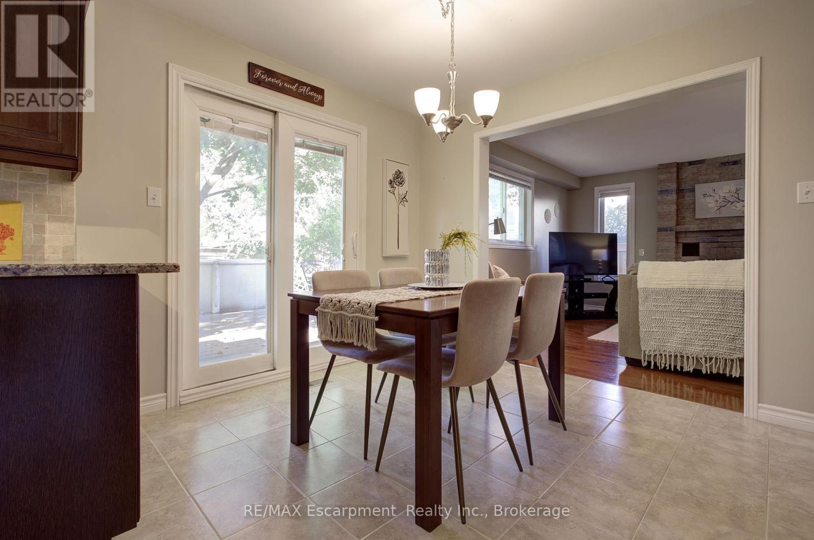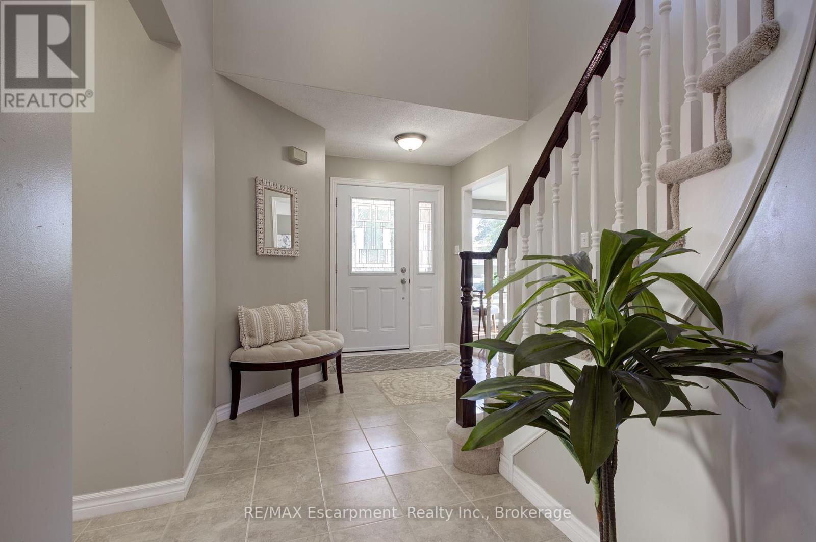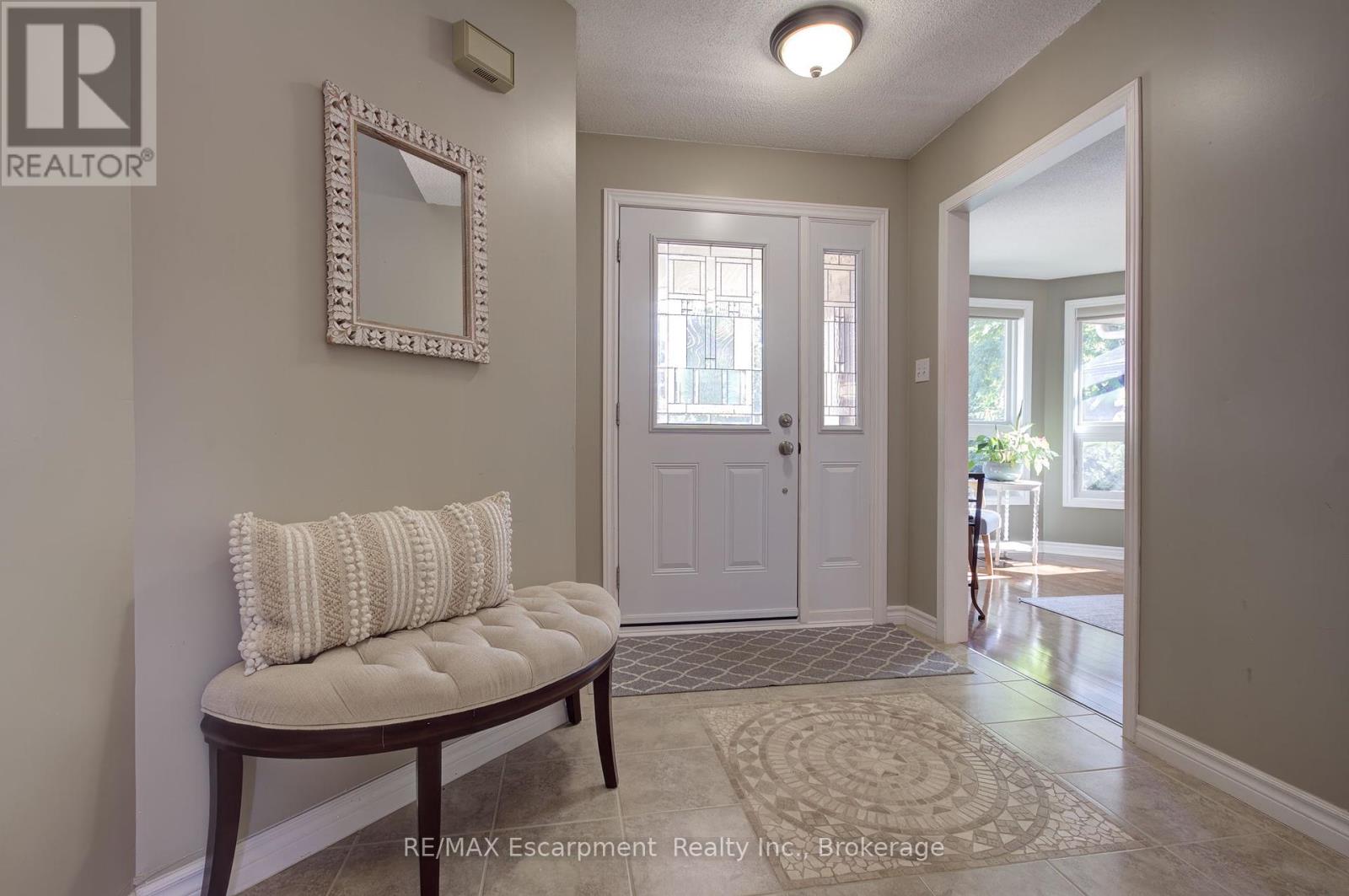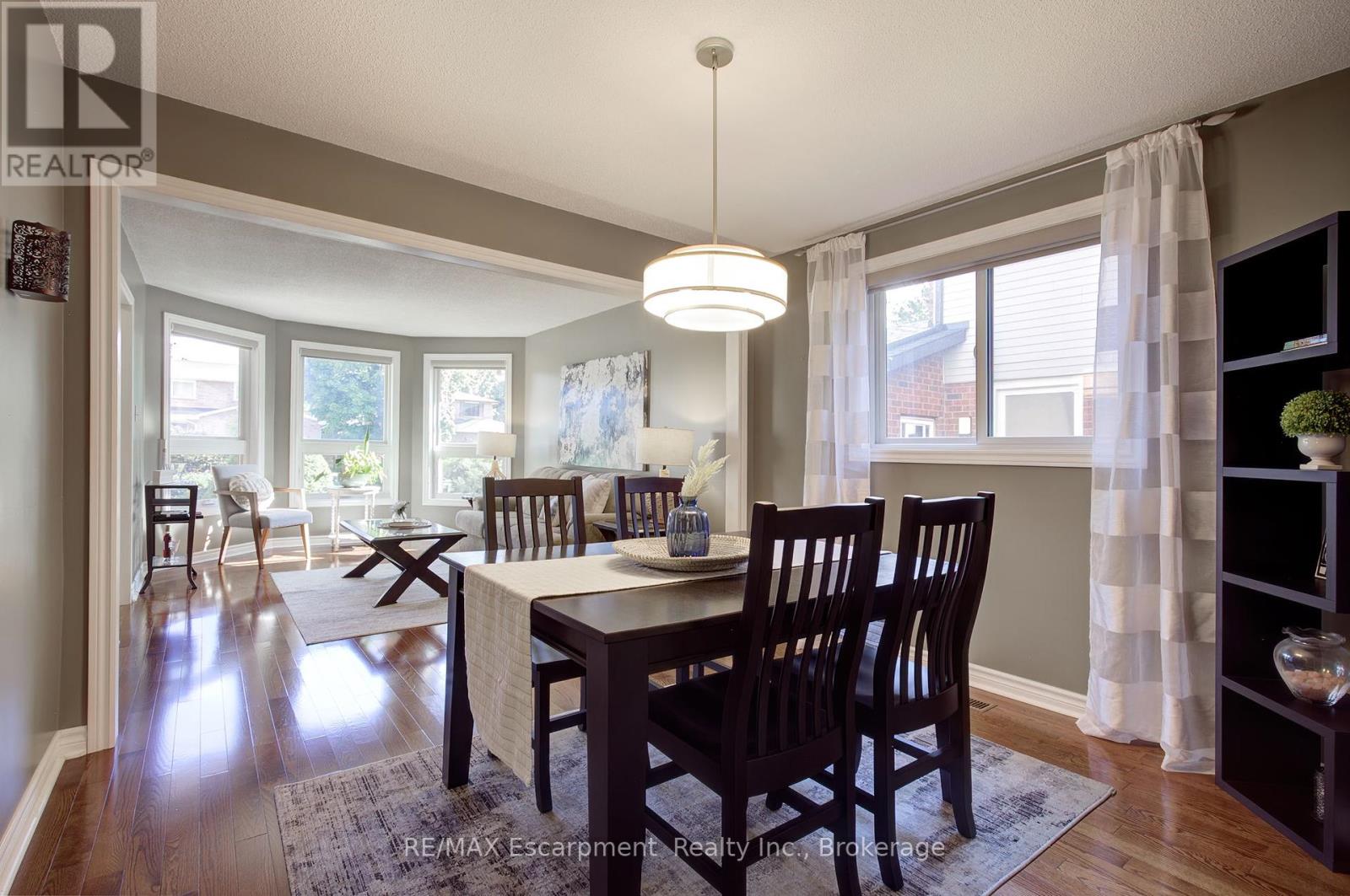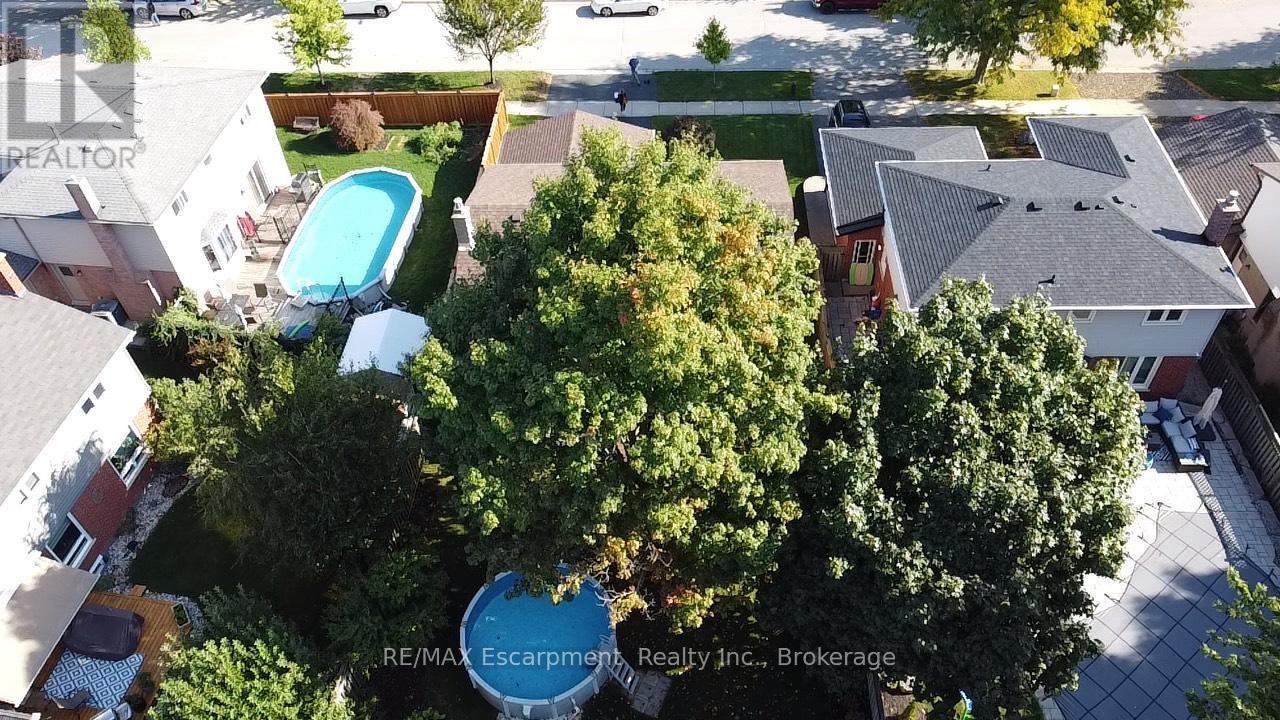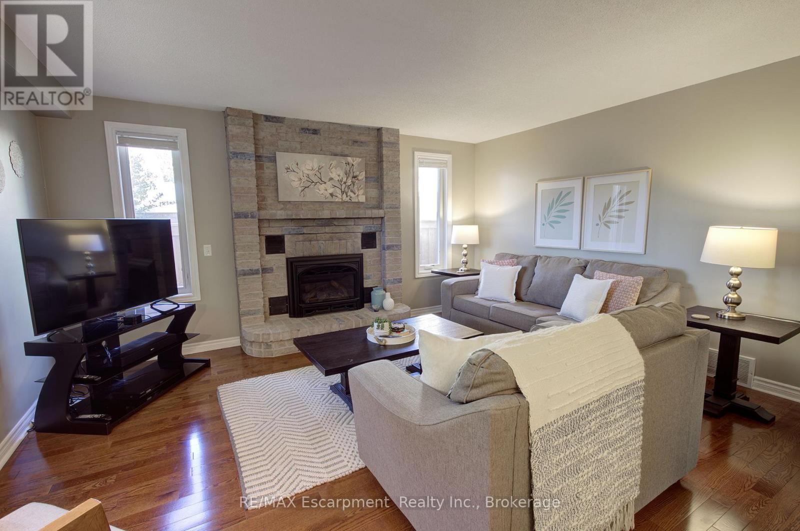 Beautifully updated and meticulously cared for 2-storey home in a highly sought-after, family-friendly central Burlington neighbourhood. Situated on a quiet street and premium mature lot, this home offers a double garage, over 2000 sqft of living space, high-end finishes, and modern conveniences throughout. Step into a spacious foyer with a grand curved staircase and soaring vaulted ceiling. Large windows and hardwood floors accent the separate living and dining rooms, ideal for formal gatherings or quiet moments. The renovated eat-in kitchen boasts granite counters, stainless steel appliances, abundant cabinetry (extra deep double-wide pantry) and a walkout to an expansive deck and private backyard oasis. The family room, features a cozy gas fireplace and flows seamlessly from the kitchen, providing an open layout perfect for entertaining and family living. The main floor also includes a powder room, laundry/mudroom, and inside access to the garage. Upstairs, you'll find three spacious bedrooms. The primary suite includes a walk-in closet with custom organizers and a beautifully updated ensuite with a glass shower. The other two bedrooms share a stylish 5-piece bathroom with double sinks and quartz counters. Meanwhile, the basement offers a versatile rec room, ideal for a home office, gym, or playroom, plus generous storage and future development potential. Enjoy a mature backyard with a heated above-ground saltwater pool, plenty of grassy play space, and patio area for relaxing. Updates include: windows (2022), roof (2023), doors, (over last 12 years), furnace & AC (2011), bathrooms (2017/2019), gutter guards and more. With top-rated schools, parks, shopping, rec centres, and transit nearby, this is the perfect home for any growing family! (id:24334)