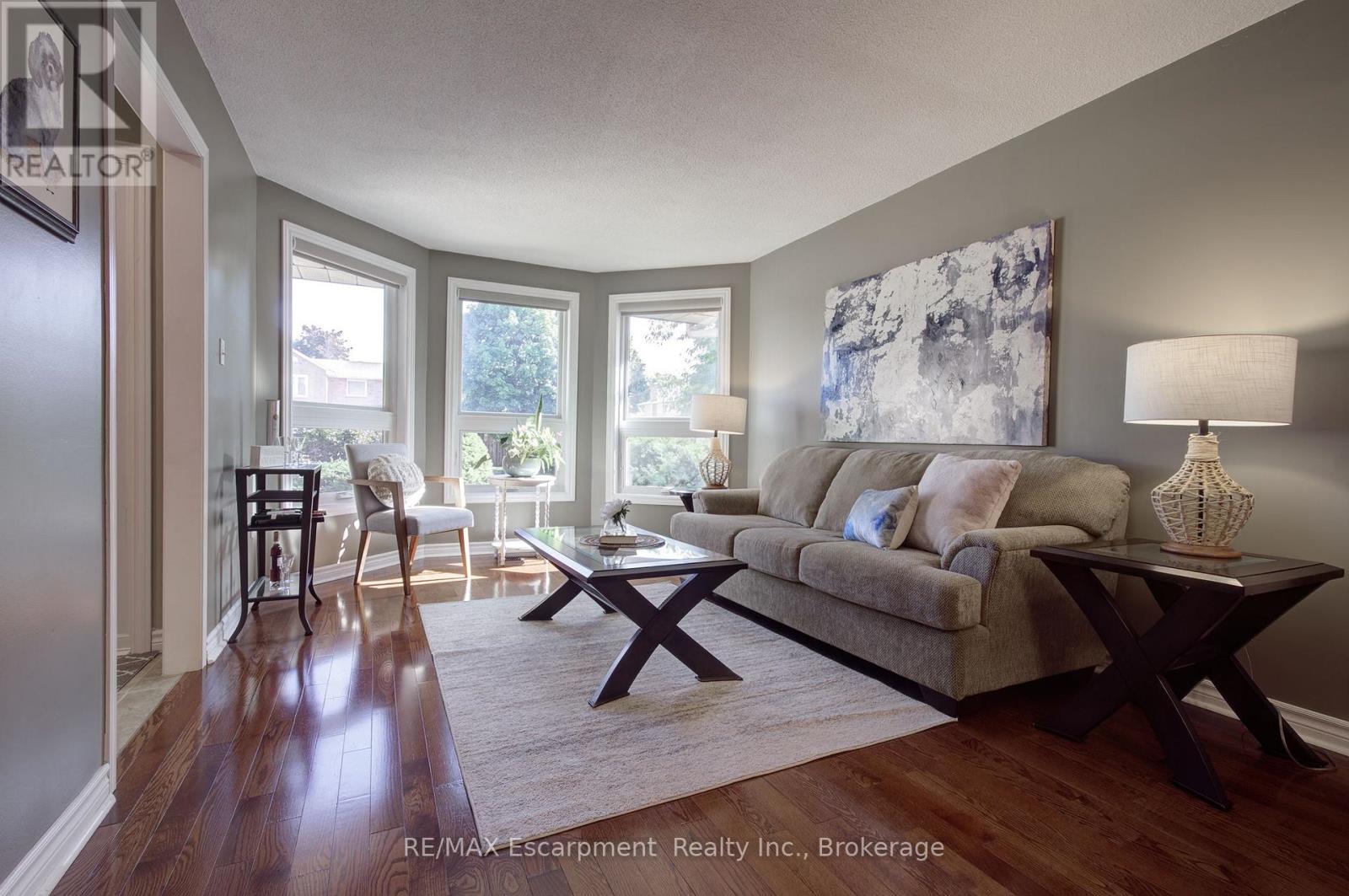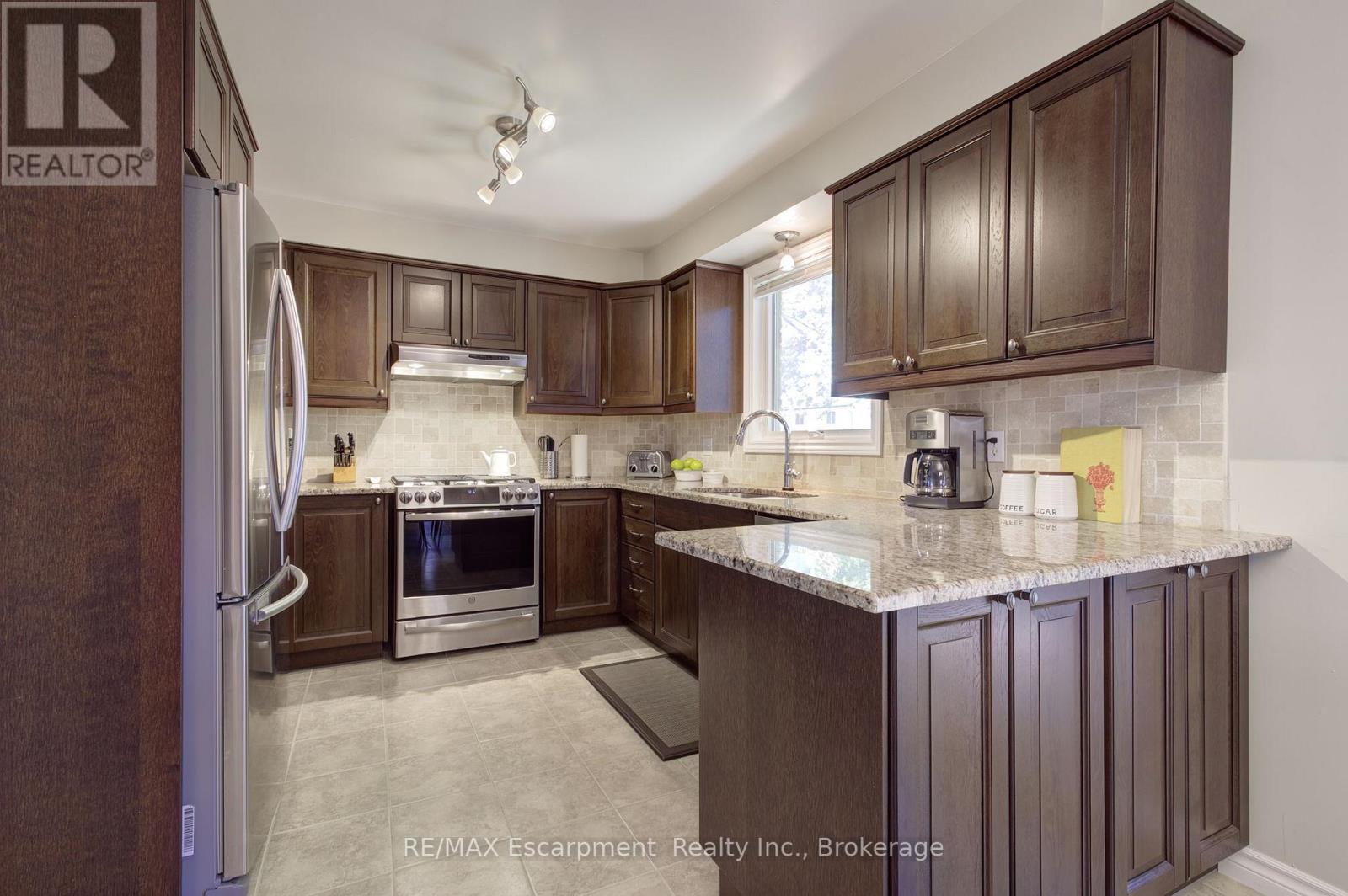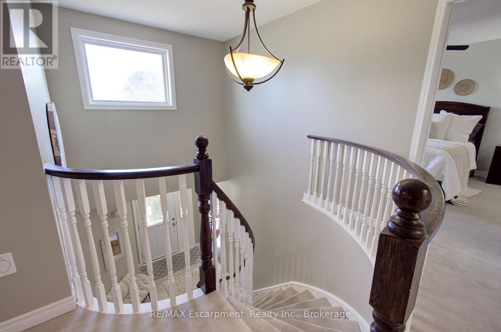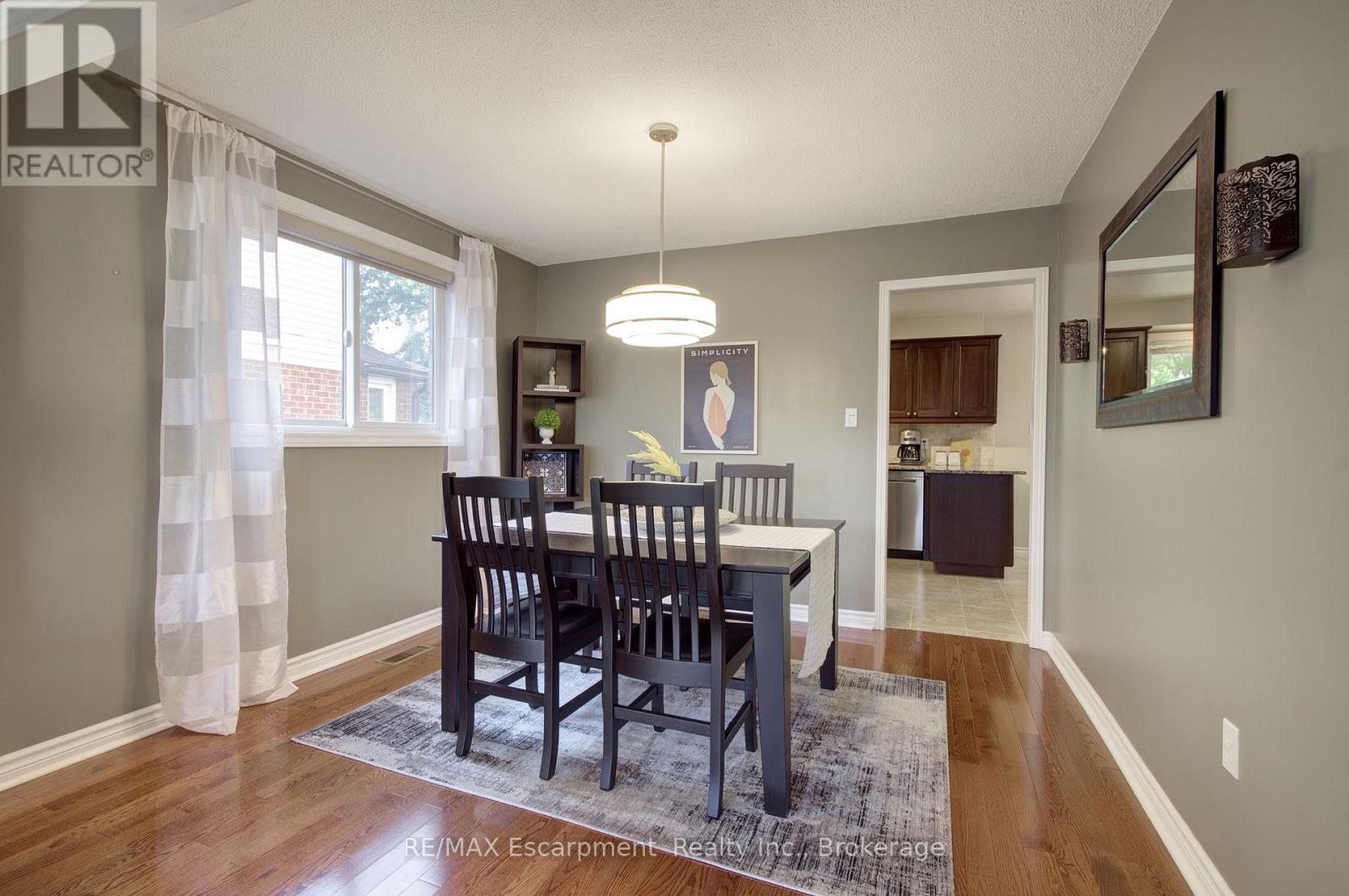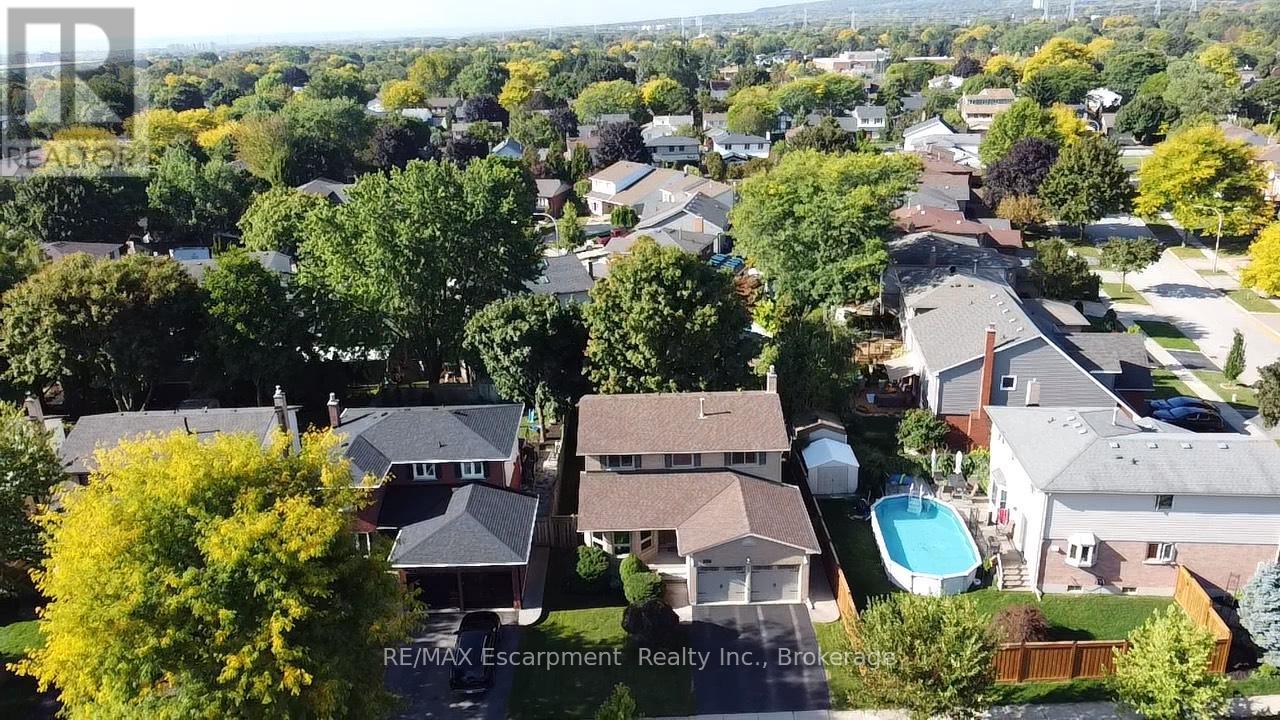 Beautifully updated and meticulously cared for 2-storey home in a highly sought-after, family-friendly central Burlington neighbourhood. Situated on a quiet street and premium mature lot, this home offers a double garage, over 2000 sqft of living space, high-end finishes, and modern conveniences throughout. Step into a spacious foyer with a grand curved staircase and soaring vaulted ceiling. Large windows and hardwood floors accent the separate living and dining rooms, ideal for formal gatherings or quiet moments. The renovated eat-in kitchen boasts granite counters, stainless steel appliances, abundant cabinetry (extra deep double-wide pantry) and a walkout to an expansive deck and private backyard oasis. The family room, features a cozy gas fireplace and flows seamlessly from the kitchen, providing an open layout perfect for entertaining and family living. The main floor also includes a powder room, laundry/mudroom, and inside access to the garage. Upstairs, you'll find three spacious bedrooms. The primary suite includes a walk-in closet with custom organizers and a beautifully updated ensuite with a glass shower. The other two bedrooms share a stylish 5-piece bathroom with double sinks and quartz counters. Meanwhile, the basement offers a versatile rec room, ideal for a home office, gym, or playroom, plus generous storage and future development potential. Enjoy a mature backyard with a heated above-ground saltwater pool, plenty of grassy play space, and patio area for relaxing. Updates include: windows (2022), roof (2023), doors, (over last 12 years), furnace & AC (2011), bathrooms (2017/2019), gutter guards and more. With top-rated schools, parks, shopping, rec centres, and transit nearby, this is the perfect home for any growing family! (id:24334)