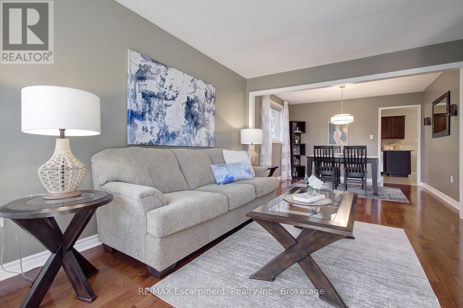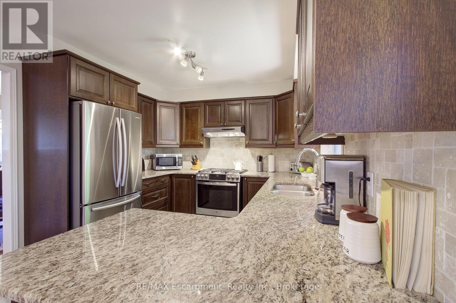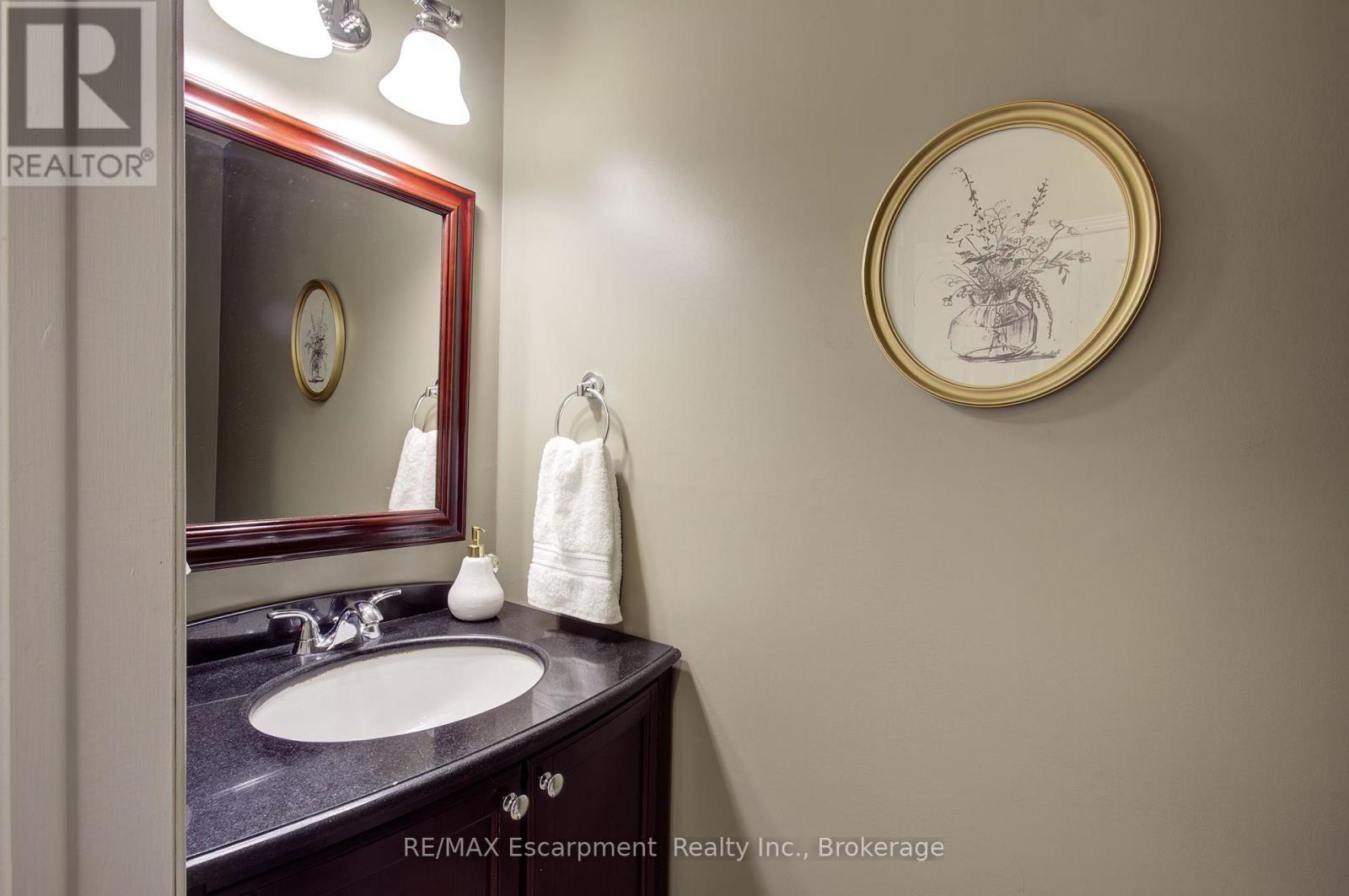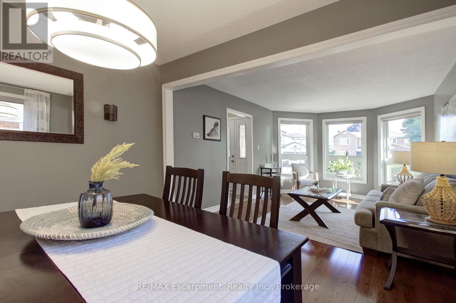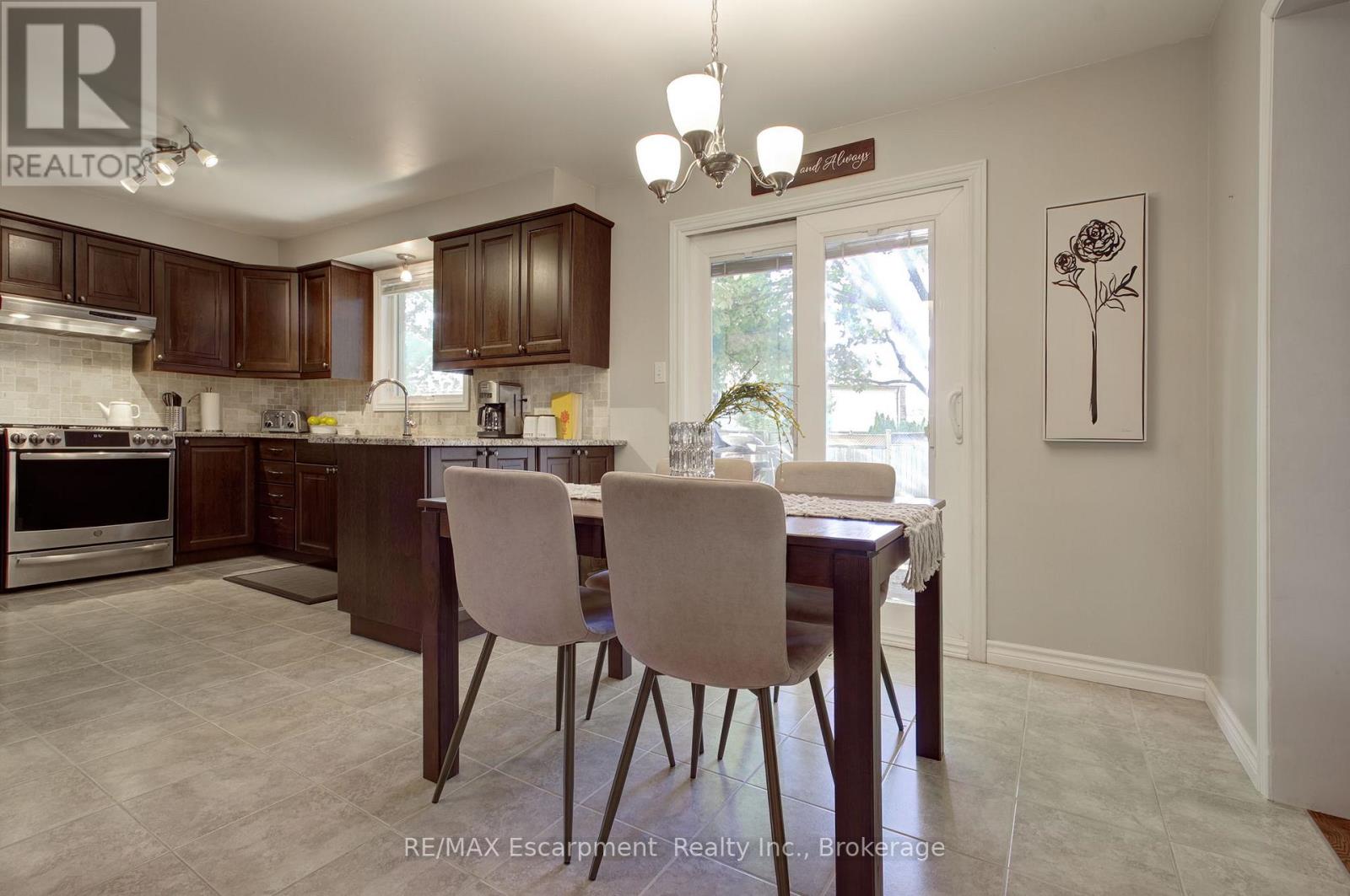 Beautifully updated and meticulously cared for 2-storey home in a highly sought-after, family-friendly central Burlington neighbourhood. Situated on a quiet street and premium mature lot, this home offers a double garage, over 2000 sqft of living space, high-end finishes, and modern conveniences throughout. Step into a spacious foyer with a grand curved staircase and soaring vaulted ceiling. Large windows and hardwood floors accent the separate living and dining rooms, ideal for formal gatherings or quiet moments. The renovated eat-in kitchen boasts granite counters, stainless steel appliances, abundant cabinetry (extra deep double-wide pantry) and a walkout to an expansive deck and private backyard oasis. The family room, features a cozy gas fireplace and flows seamlessly from the kitchen, providing an open layout perfect for entertaining and family living. The main floor also includes a powder room, laundry/mudroom, and inside access to the garage. Upstairs, you'll find three spacious bedrooms. The primary suite includes a walk-in closet with custom organizers and a beautifully updated ensuite with a glass shower. The other two bedrooms share a stylish 5-piece bathroom with double sinks and quartz counters. Meanwhile, the basement offers a versatile rec room, ideal for a home office, gym, or playroom, plus generous storage and future development potential. Enjoy a mature backyard with a heated above-ground saltwater pool, plenty of grassy play space, and patio area for relaxing. Updates include: windows (2022), roof (2023), doors, (over last 12 years), furnace & AC (2011), bathrooms (2017/2019), gutter guards and more. With top-rated schools, parks, shopping, rec centres, and transit nearby, this is the perfect home for any growing family! (id:24334)