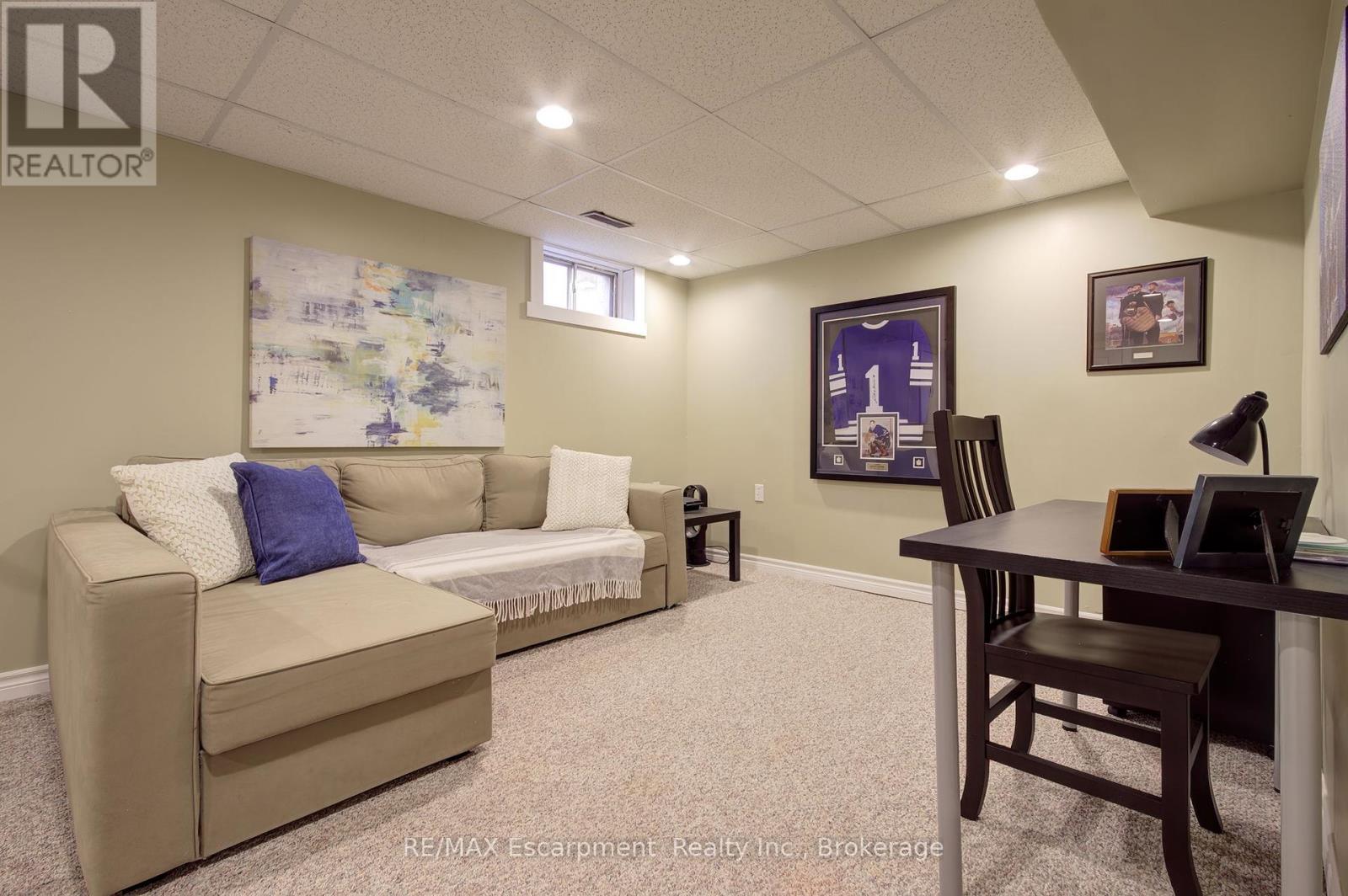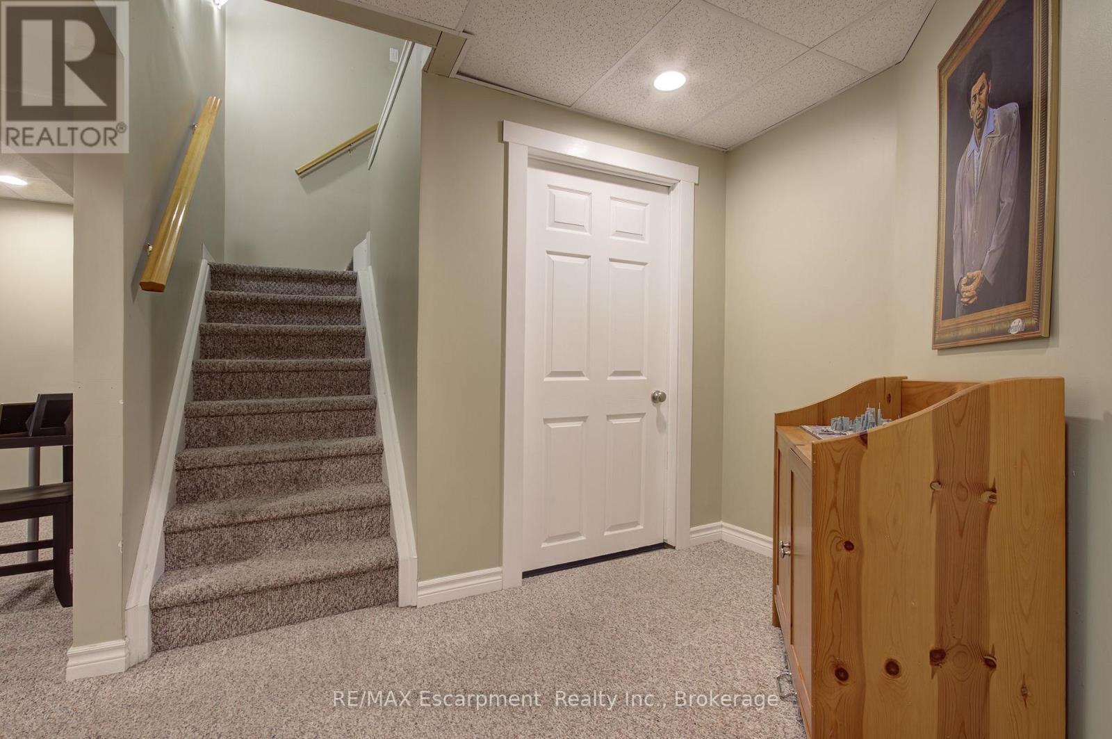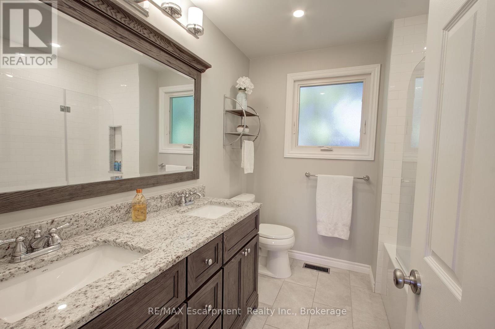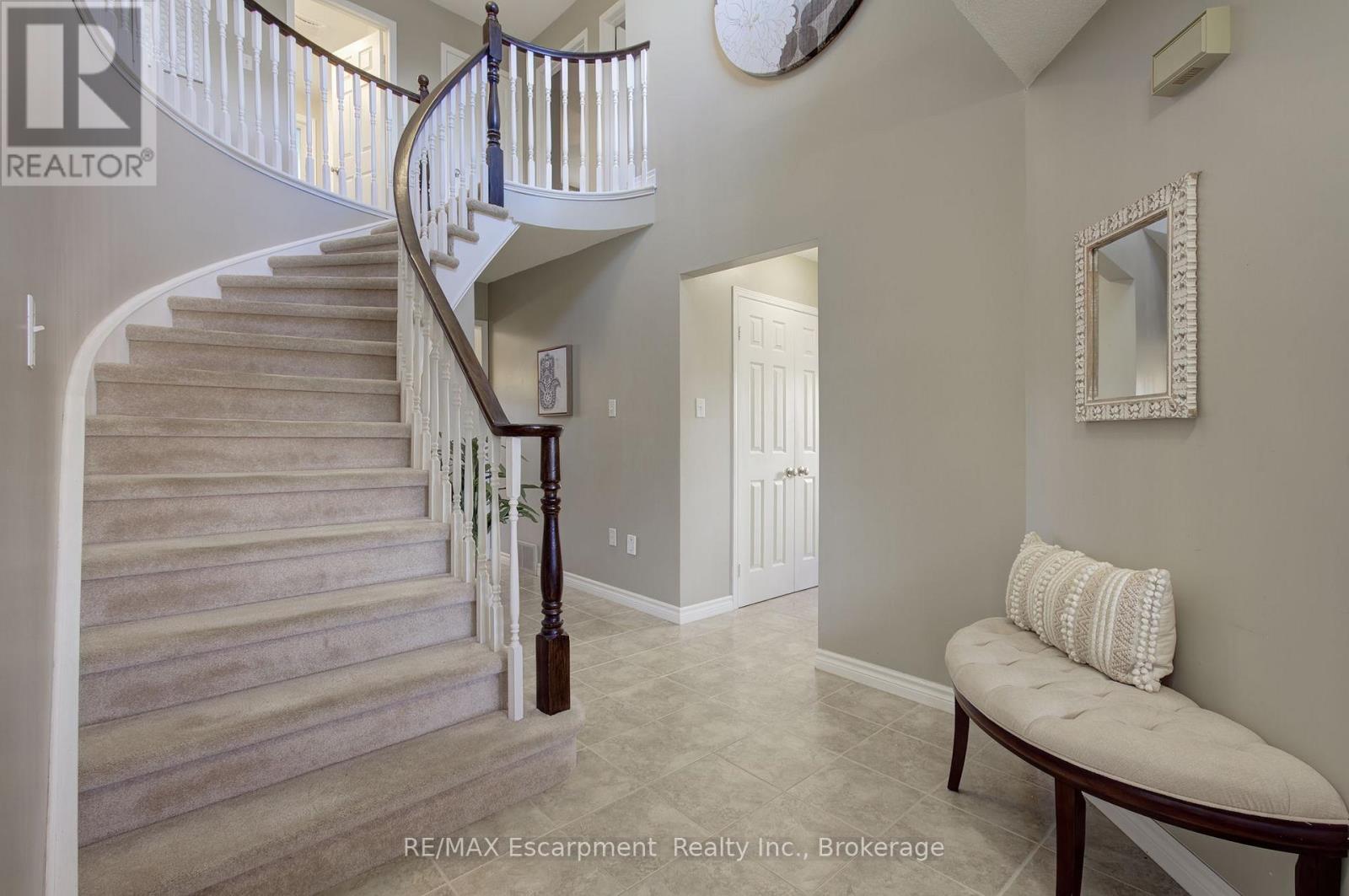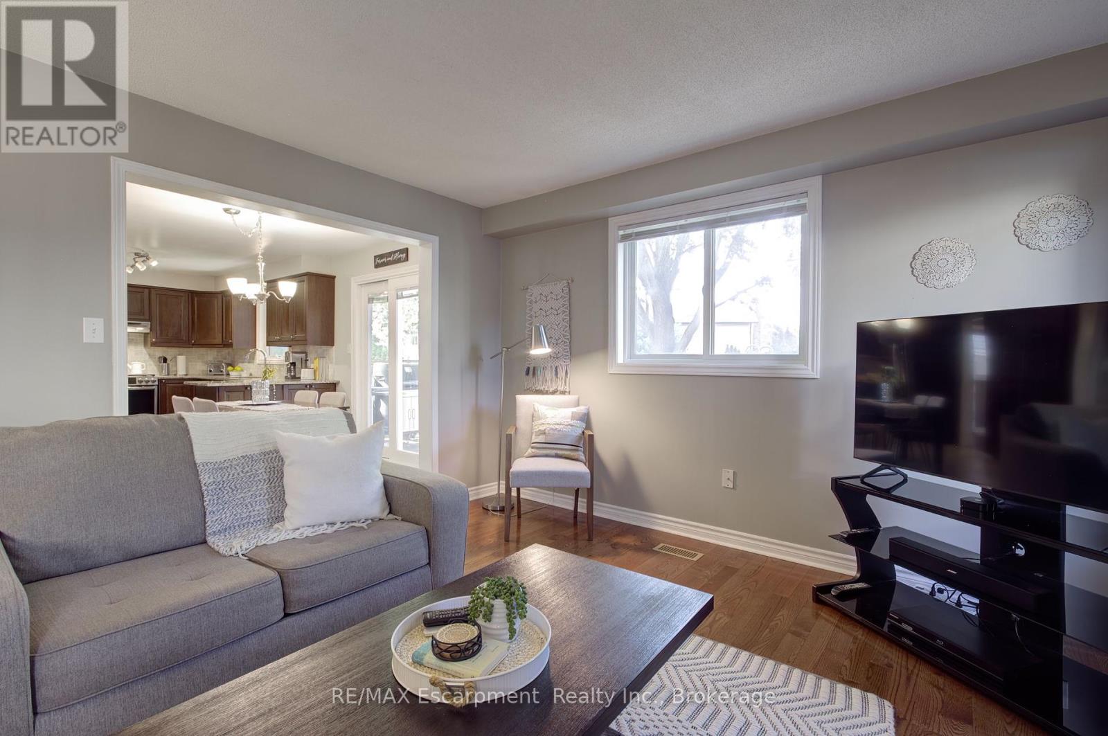 Beautifully updated and meticulously cared for 2-storey home in a highly sought-after, family-friendly central Burlington neighbourhood. Situated on a quiet street and premium mature lot, this home offers a double garage, over 2000 sqft of living space, high-end finishes, and modern conveniences throughout. Step into a spacious foyer with a grand curved staircase and soaring vaulted ceiling. Large windows and hardwood floors accent the separate living and dining rooms, ideal for formal gatherings or quiet moments. The renovated eat-in kitchen boasts granite counters, stainless steel appliances, abundant cabinetry (extra deep double-wide pantry) and a walkout to an expansive deck and private backyard oasis. The family room, features a cozy gas fireplace and flows seamlessly from the kitchen, providing an open layout perfect for entertaining and family living. The main floor also includes a powder room, laundry/mudroom, and inside access to the garage. Upstairs, you'll find three spacious bedrooms. The primary suite includes a walk-in closet with custom organizers and a beautifully updated ensuite with a glass shower. The other two bedrooms share a stylish 5-piece bathroom with double sinks and quartz counters. Meanwhile, the basement offers a versatile rec room, ideal for a home office, gym, or playroom, plus generous storage and future development potential. Enjoy a mature backyard with a heated above-ground saltwater pool, plenty of grassy play space, and patio area for relaxing. Updates include: windows (2022), roof (2023), doors, (over last 12 years), furnace & AC (2011), bathrooms (2017/2019), gutter guards and more. With top-rated schools, parks, shopping, rec centres, and transit nearby, this is the perfect home for any growing family! (id:24334)