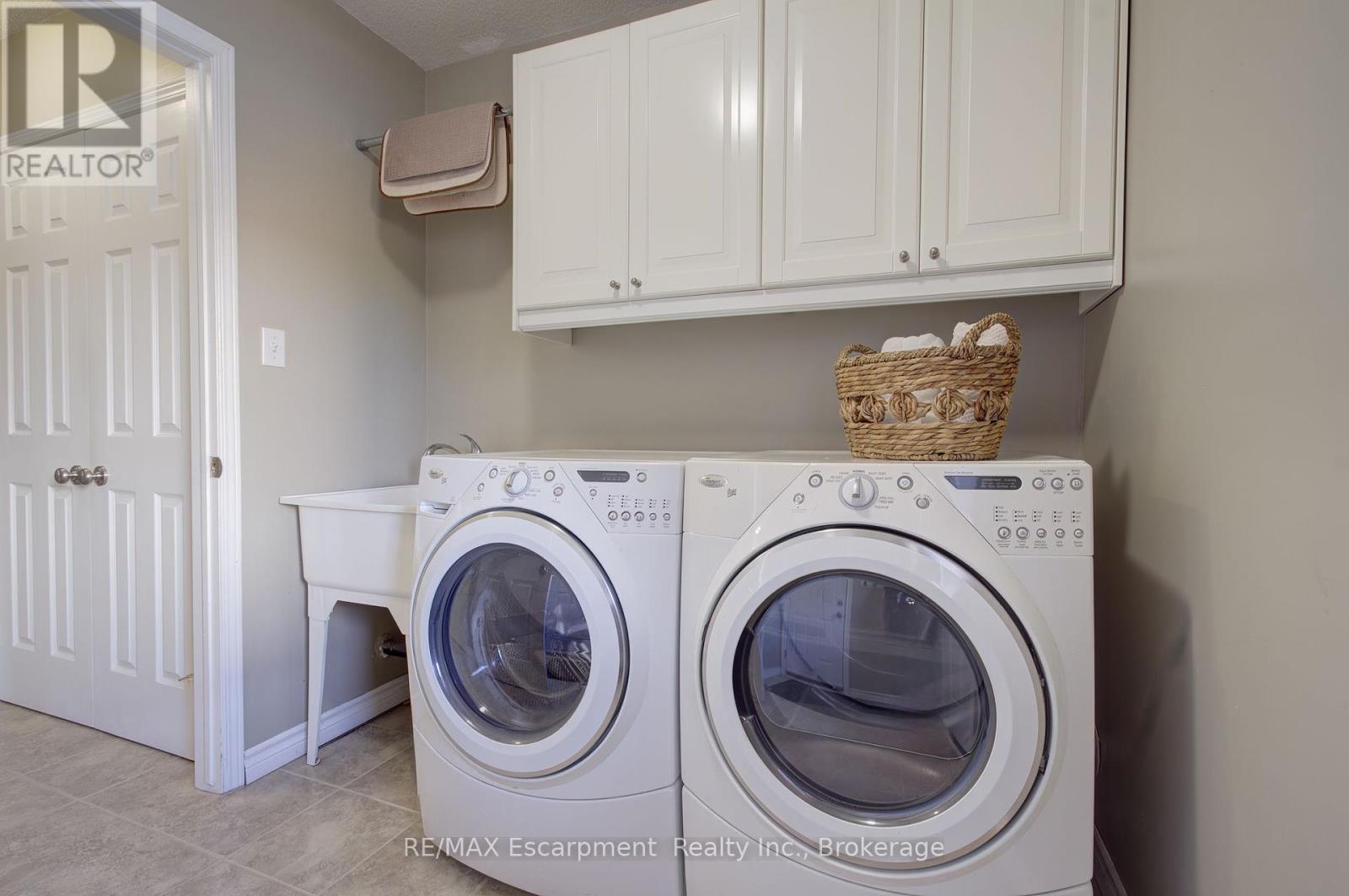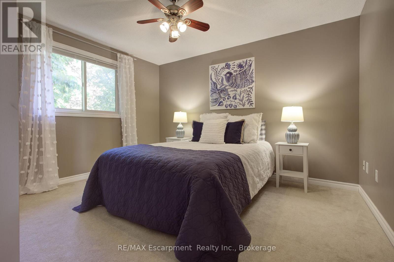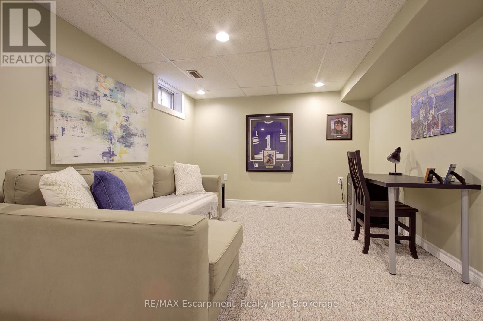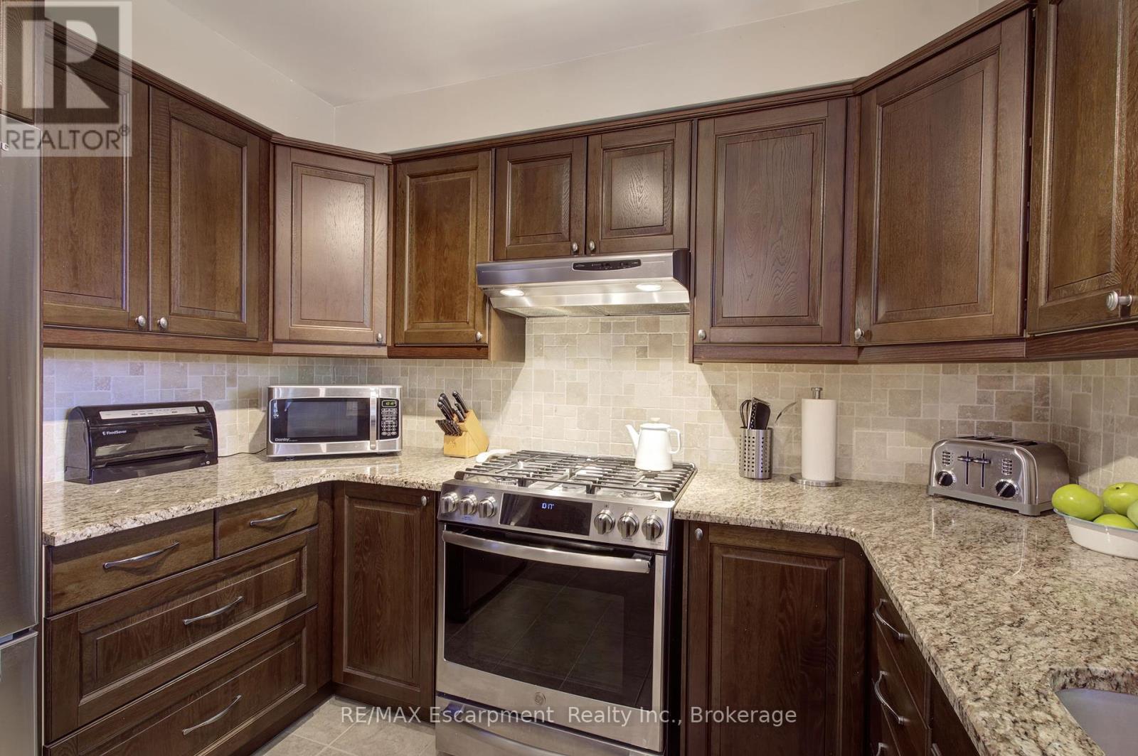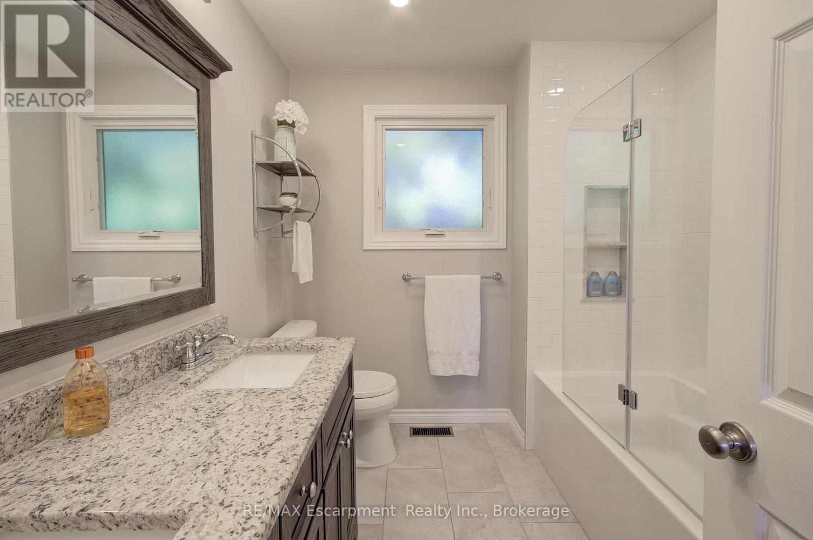 Beautifully updated and meticulously cared for 2-storey home in a highly sought-after, family-friendly central Burlington neighbourhood. Situated on a quiet street and premium mature lot, this home offers a double garage, over 2000 sqft of living space, high-end finishes, and modern conveniences throughout. Step into a spacious foyer with a grand curved staircase and soaring vaulted ceiling. Large windows and hardwood floors accent the separate living and dining rooms, ideal for formal gatherings or quiet moments. The renovated eat-in kitchen boasts granite counters, stainless steel appliances, abundant cabinetry (extra deep double-wide pantry) and a walkout to an expansive deck and private backyard oasis. The family room, features a cozy gas fireplace and flows seamlessly from the kitchen, providing an open layout perfect for entertaining and family living. The main floor also includes a powder room, laundry/mudroom, and inside access to the garage. Upstairs, you'll find three spacious bedrooms. The primary suite includes a walk-in closet with custom organizers and a beautifully updated ensuite with a glass shower. The other two bedrooms share a stylish 5-piece bathroom with double sinks and quartz counters. Meanwhile, the basement offers a versatile rec room, ideal for a home office, gym, or playroom, plus generous storage and future development potential. Enjoy a mature backyard with a heated above-ground saltwater pool, plenty of grassy play space, and patio area for relaxing. Updates include: windows (2022), roof (2023), doors, (over last 12 years), furnace & AC (2011), bathrooms (2017/2019), gutter guards and more. With top-rated schools, parks, shopping, rec centres, and transit nearby, this is the perfect home for any growing family! (id:24334)