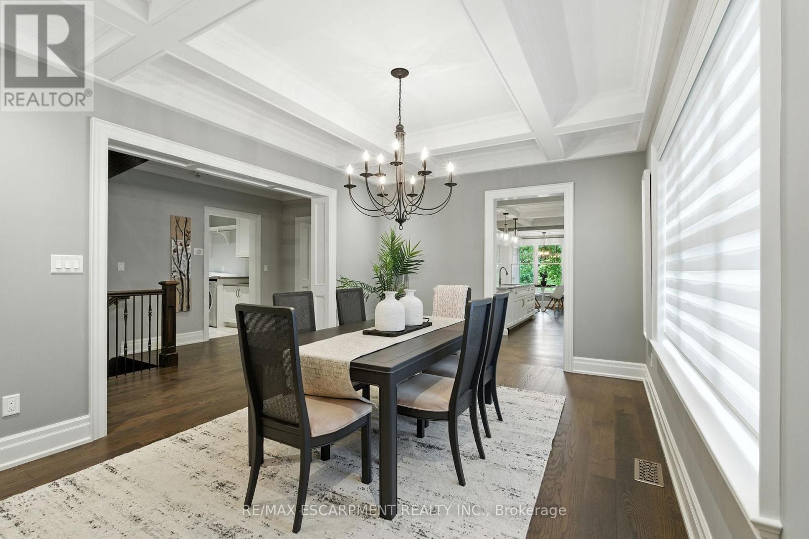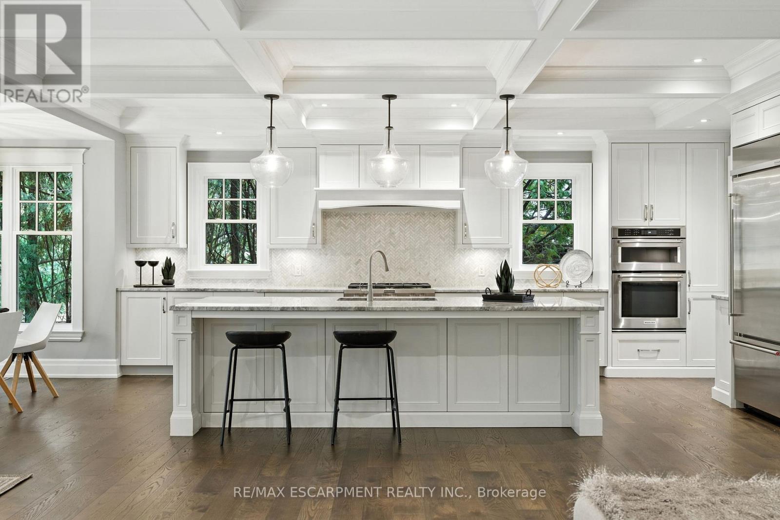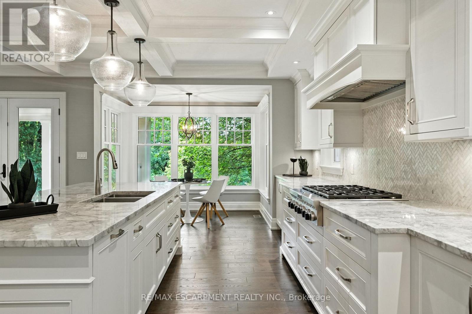 Custom-built in 2016, this exceptional residence offers approximately 5,000 square feet of luxurious living space, showcasing premium finishes and superior craftsmanship throughout. Situated on a 217-ft deep, pool-sized lot backing onto the RBG Hendrie Valley Sanctuary, this home blends elegance with natural serenity. The gourmet kitchen features a large island with dual-sided cabinetry, sink and pendant lighting, along with built-in stainless steel appliances including a wall oven, gas cooktop, fridge and dishwasher plus a sunlit eat-in area overlooking the private backyard. Rich hardwood flooring spans the main and second levels, complemented by hardwood stairs, coffered ceilings, crown moulding and pot lights that add warmth and architectural detail. The private primary suite includes a luxurious spa-like ensuite and two walk-in closets with custom built-ins. A finished walk-out lower level adds flexible living space, offering a fifth bedroom, full bathroom, rec room and multi-use area perfect for an office, gym, craft room or playroom. An upper-level balcony off the great room extends the living space outdoors and features a gas BBQ hook-up. Additional highlights include oversized windows, engineered hardwood, central vacuum and full home pre-wiring for automation and audio/video distribution. Ideally located minutes from Aldershot GO Station, Highways 403 and 407, as well as nearby restaurants and shopping. RSA. Luxury Certified. (id:24334)