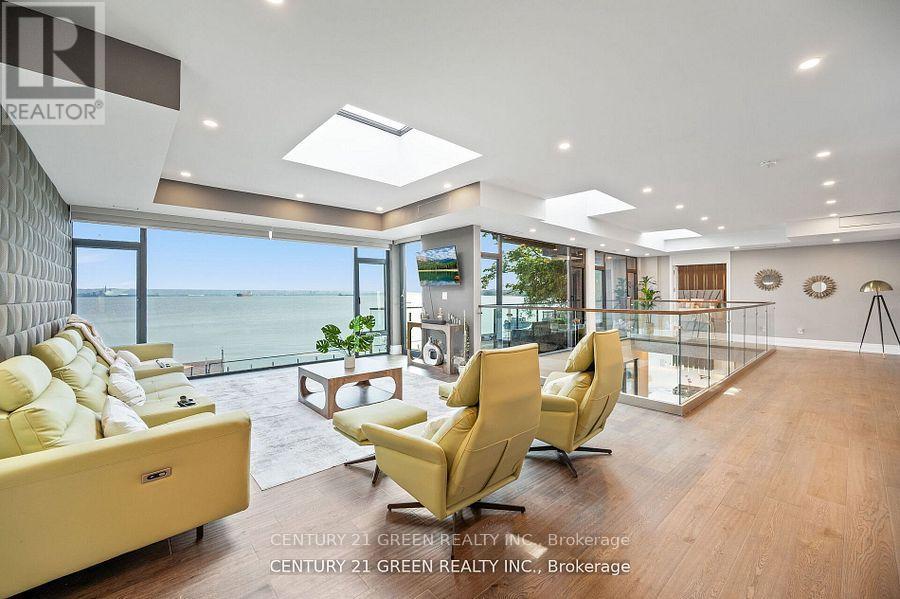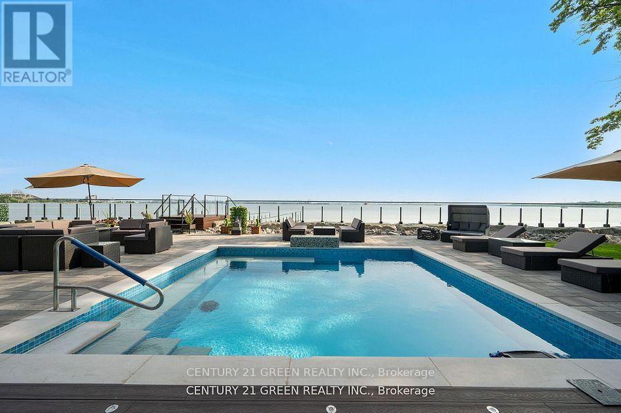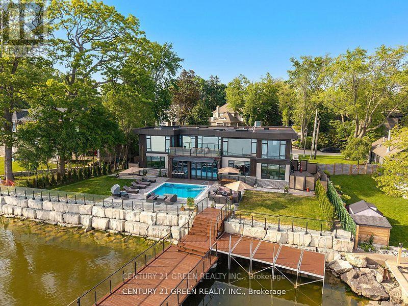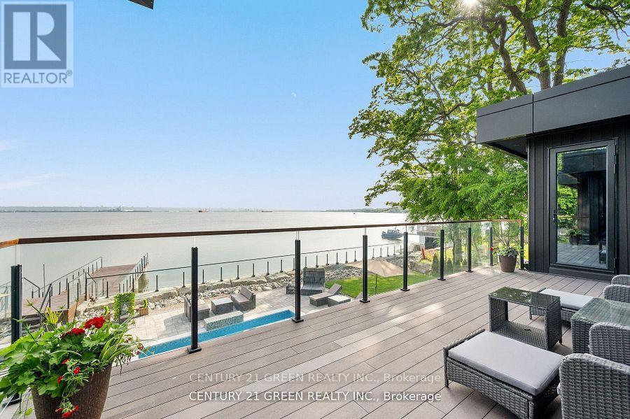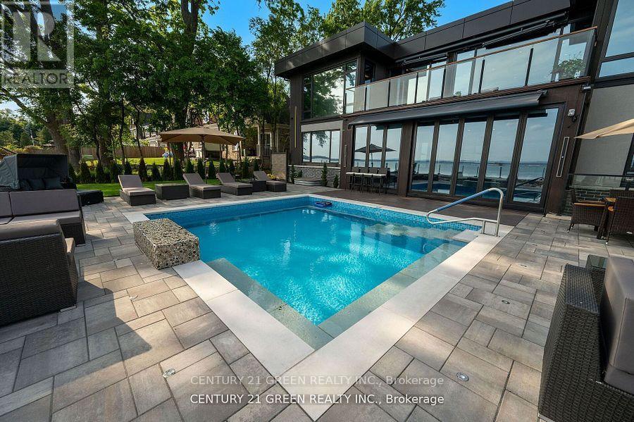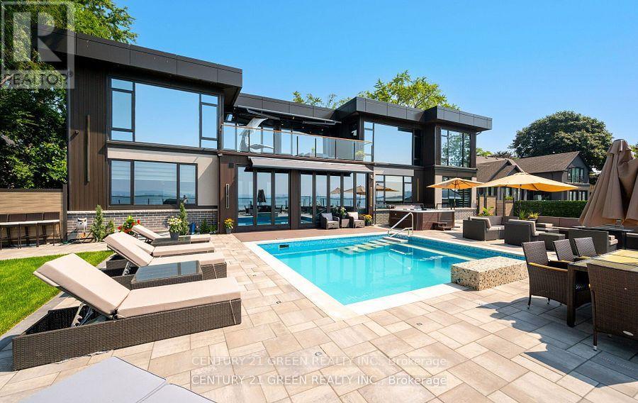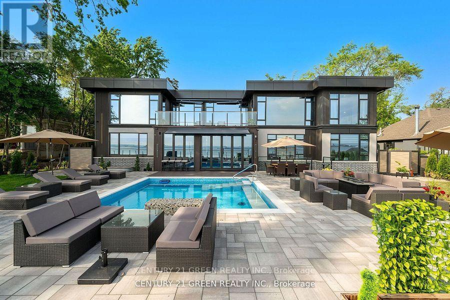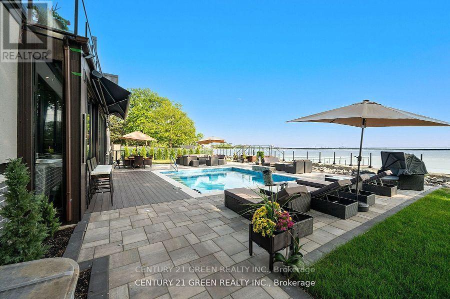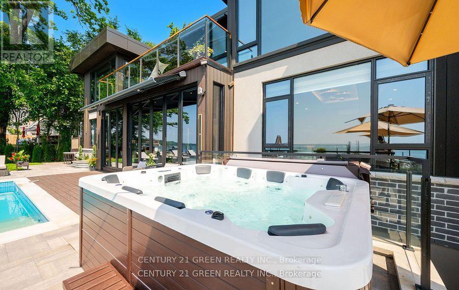 Lakefront newly custom-built home feels like a retreat, completed in November 2024, offering over 6,350 sq ft of total living space across three levels with gorgeous panoramic water view of Lake Ontario. This house features 120 feet of private shoreline and a private dock to Lake Ontario with PRIVATE BOAT ACCESS. With an 83' frontage that widens to 120' along the lakeside. This home features 5+3 bedrooms and 7.5 bathrooms with a Main floor 10ft and cathedral ceilings. The home is a masterclass in design and craftsmanship, with 10' ceilings (main), and cathedral ceilings & 9-foot ceilings (2nd flr). The main floor has a bedroom with an ensuite as guest room. The upper level features four bedrooms, each with its own ensuite. Large enclosed patio with complete opening BI folding door (10ft) and enclosed hot tub. 3 large skylights. Finished basement with separate entrance featuring a wet bar & kitchen, two sump pumps. This home features a heated swimming pool facing Lake Ontario. Situated just a short walk from vibrant downtown Burlington, parks, the waterfront trail, and with easy access to major highways, this location balances tranquility and convenience. Smart toilets in every washroom. With a Jacuzzi hot tub, double garage with 3 parking spaces (tandem) & outdoor parking for 5,this is a one-of-a-kind beachside sanctuary designed for elevated everyday living. 2 electric car chargers. (id:24334)