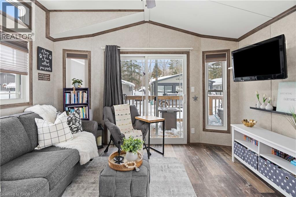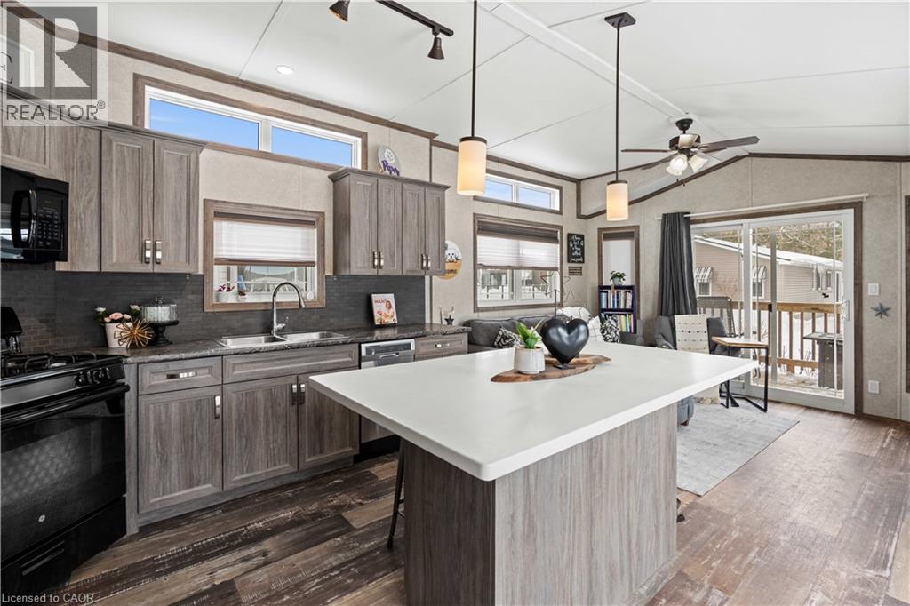 Welcome to this meticulously maintained custom built modular home with metal roof, nestled within the sought-after Lost Forest Park Gated Community. Immerse yourself in the conveniences of this year-round community, which boasts a community centre, an in-ground pool, picturesque walking trails, and other amenities. This home features a charming wrap-around deck equipped with retractable screens, providing privacy and relaxation. The open-concept interior is adorned with driftwood laminate flooring and double-hung windows, ensuring effortless cleaning. The kitchen features grey cabinets, a spacious centre island with Corian top, perfect for entertaining family and friends. The great room exudes a bright and inviting ambiance with an additional access to the deck. Conveniently located in the hallway is your in-suite laundry, HVAC system, and double closet for storage. The primary bedroom boasts a double closet with custom-built-ins, while the den provides an ideal space for a home office or creative pursuits. Community Centre boasts Dart Boards, TV with Fire stick, Wifi, Ping Pong, Coffee maker, Games, Puzzles and a Book Exchange. This is the perfect space to engage in a vibrant, active lifestyle. Secure this exceptional opportunity and experience the unparalleled comfort and convenience of this custom built modular home. Minutes away from shopping, parks, golf, trails, highways and all that the quaint Village of Waterdown has to offer. (id:24334)
