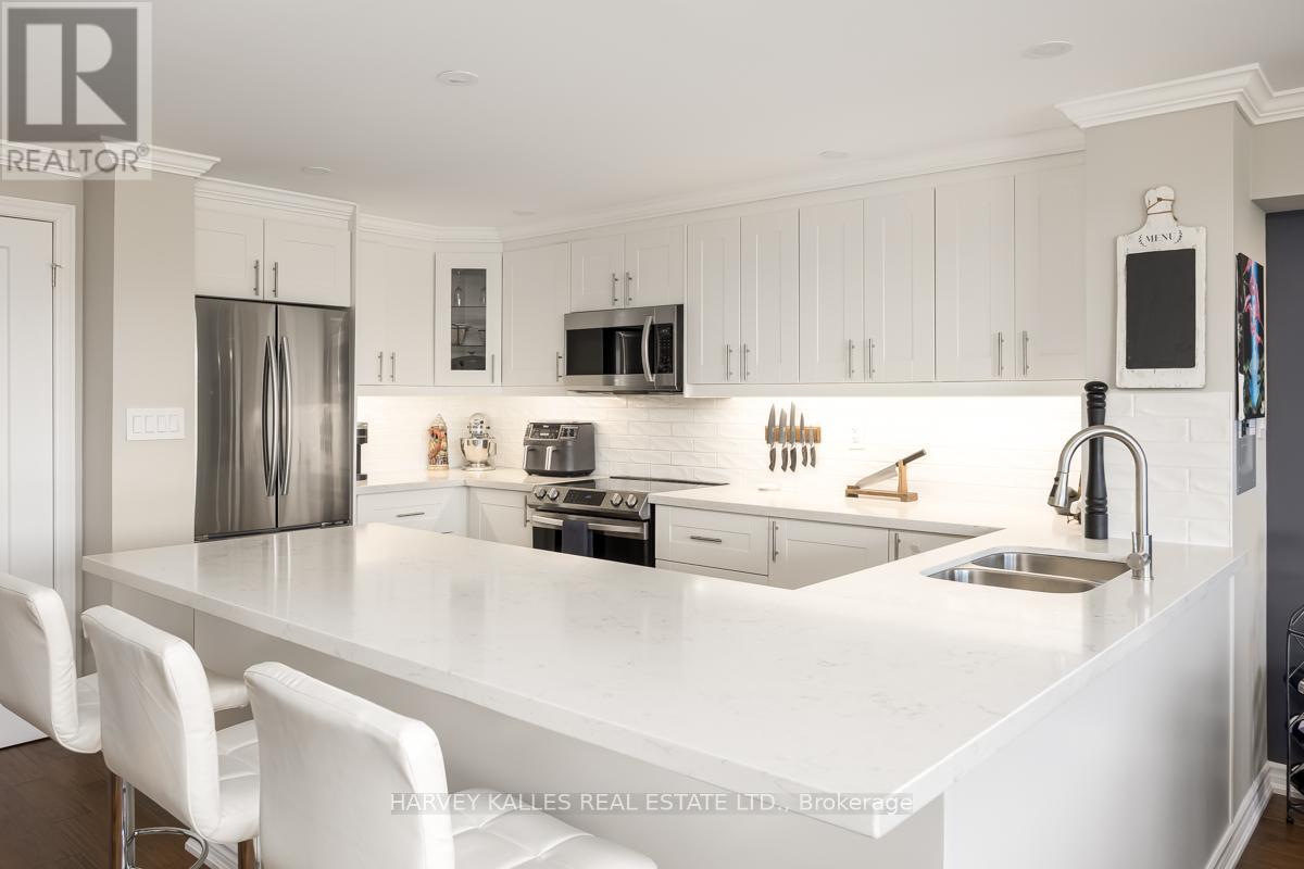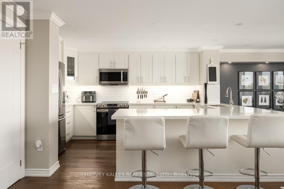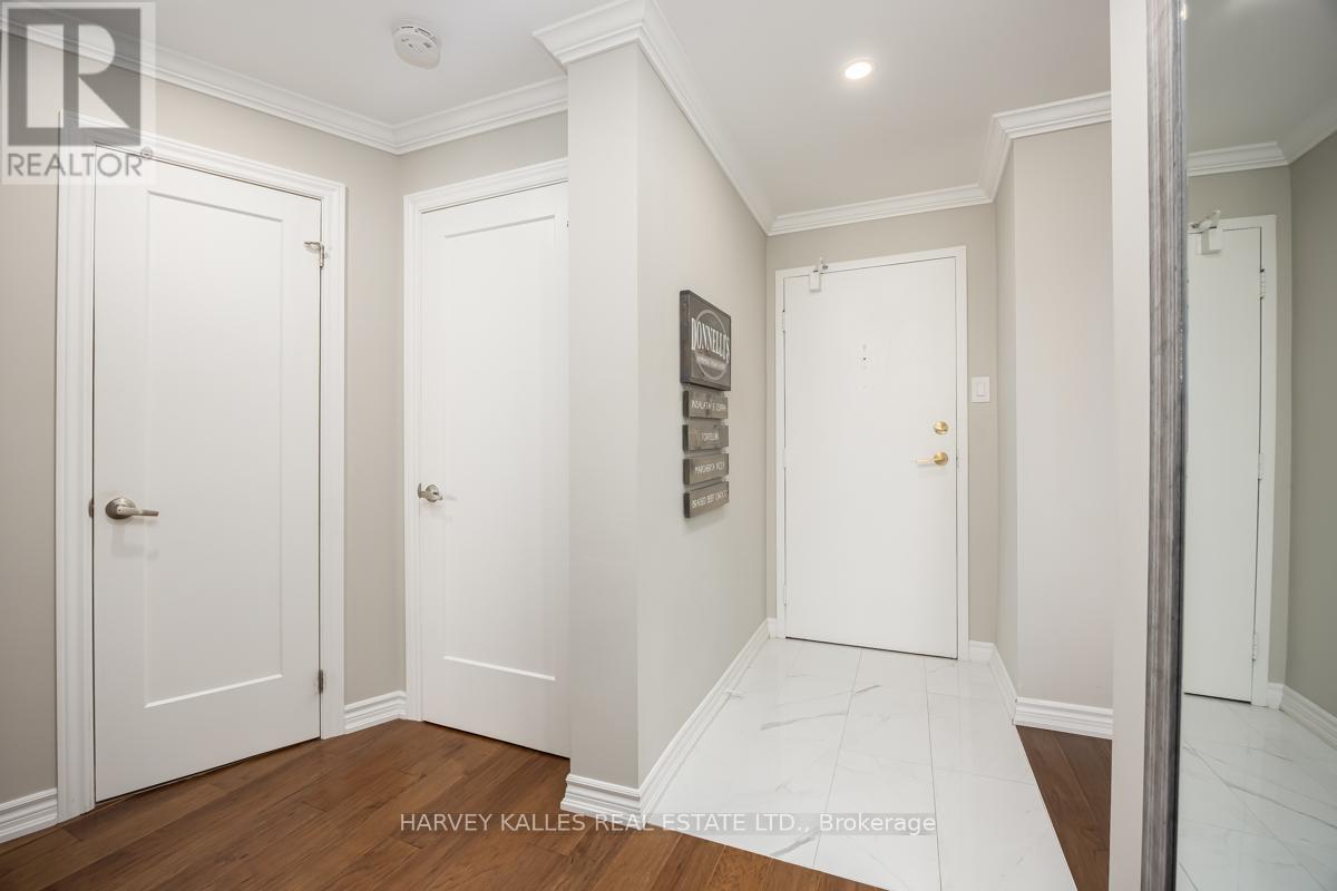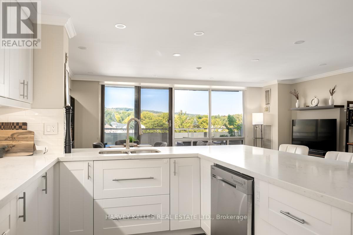 Welcome to this Stunning newly renovated bright and airy 2 Bedroom, 2 Bathroom home. One of the many special features this home offers is a chef inspired kitchen complete with a spacious breakfast bar, Quartz Countertop, Steel Appliances,2 Lazy Susan's, double undermount sink, recessed lighting and crown molding. This open concept living space is perfect to entertain both family and friends, walk out from your living area and enjoy the privacy and breathtaking view of the Niagara Escarpment from your spacious north facing balcony. Master bedroom oasis offers his and hers closets plus a bonus Storage Bench, 3 piece ensuite with vaulted Ceiling/Ambient lighting and walk in shower. Versatile 2nd bedroom with double closet, large window, recessed lighting and crown moulding can be used as an office or bedroom. 2nd 3 piece bath offers oversized walk-in shower. Enjoy the convenience of in-suite laundry, locker located on ground floor, 2 gyms, guest suite and visitor parking. Ideally located just a short walk from shopping, public transit, parks, and places of worship, with easy access to major highways, this condo offers exceptional connectivity and convenience. Condo fees includes heat, hydro, water, central air conditioning, Bell Fibe TV, building insurance, common elements, parking, and guest parking. (id:24334)