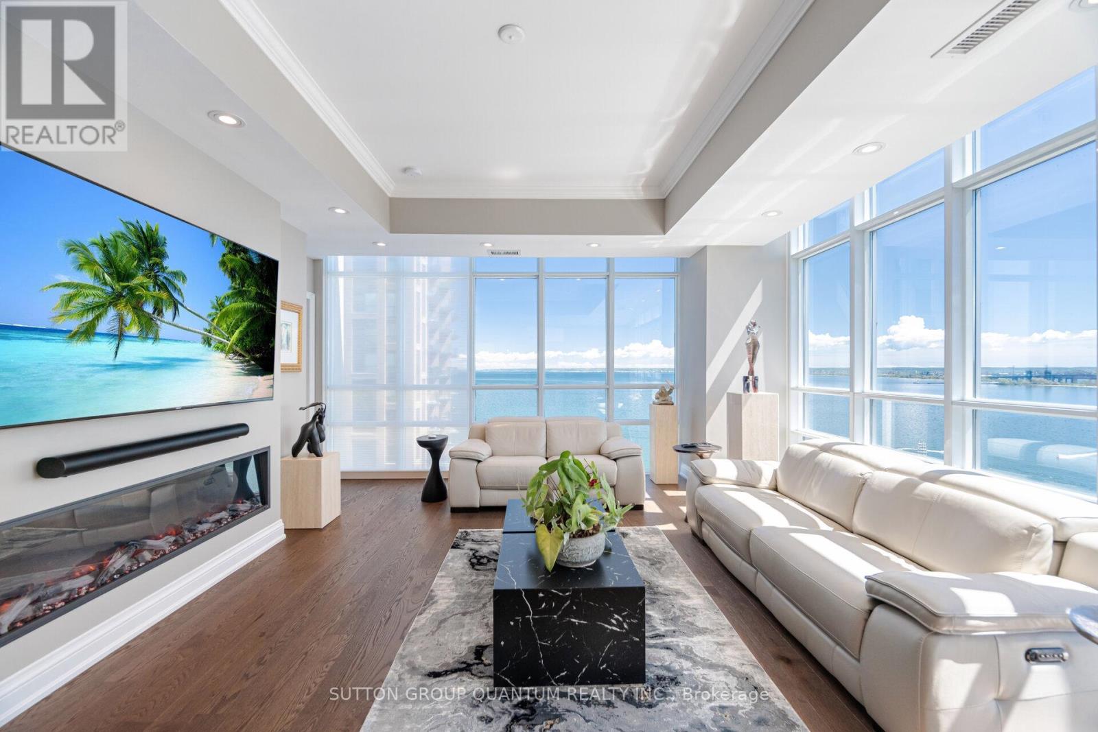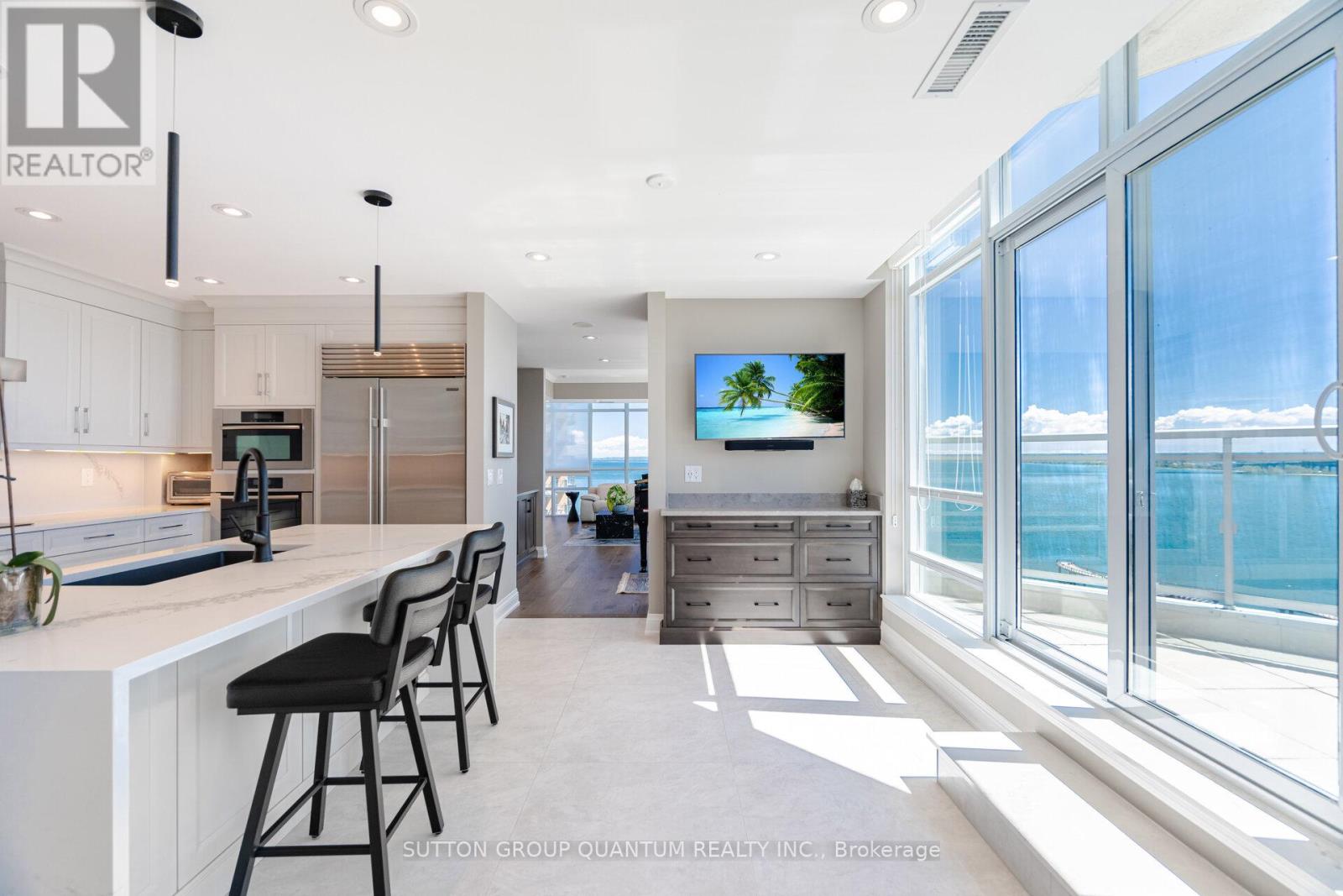 Welcome to "360 on Pearl" a Spectacular condominium Residence, where Luxury meets Waterfront tranquility in Downtown Burlington. This is a stunning, completely renovated, 3 bedroom Penthouse condominium which features over 2400 sq ft of exquisite living space and walk out to a magnificent 500 sqft private terrace (incl Gas & Water), where you can enjoy private BBQs with friends and family with unobstructed views if the Lake or a romantic night on the terrace taking in breathtaking sunsets. This unit offers 3 spacious bedrooms, one has been converted into a beautiful functional office with custom built-ins, with views of the water and a walkout to your oversized terrace. Almost all principle rooms enjoy an unobstructed view of Lake Ontario, the Niagara Escarpment and the Beautiful Town of Burlington. This Designer unit offers high ceilings, floor to ceiling windows, a bright modern style, Crestron lighting system, Modern LED pot lights, Large linear Electric Fireplace, beautiful wood floors throughout , complimented by the large 32" white porcelain tile in the Custom Gourmet kitchen with custom cabinetry, Quartz counter tops, Built-in Sub Zero fridge/freezer, Wolf Induction cooktop (gas available), Miele dishwasher, Miele convection microwave, Miele Oven, Miele warming tray, Built in Sub Zero Wine fridge with 103 botte capacity, Hunter Douglas Motorized Duette Duolite Blinds and more. This is one of only 2 Penthouse apartments with an oversized terrace overlooking the Lake in Burlington. "360 on Pearl" is a unique and highly sought after building, offering a luxurious lifestyle on the Lakefront.....enjoy picturesque parks, vibrant downtown amenities, fine dining, shopping and cultural attractions. (id:24334)